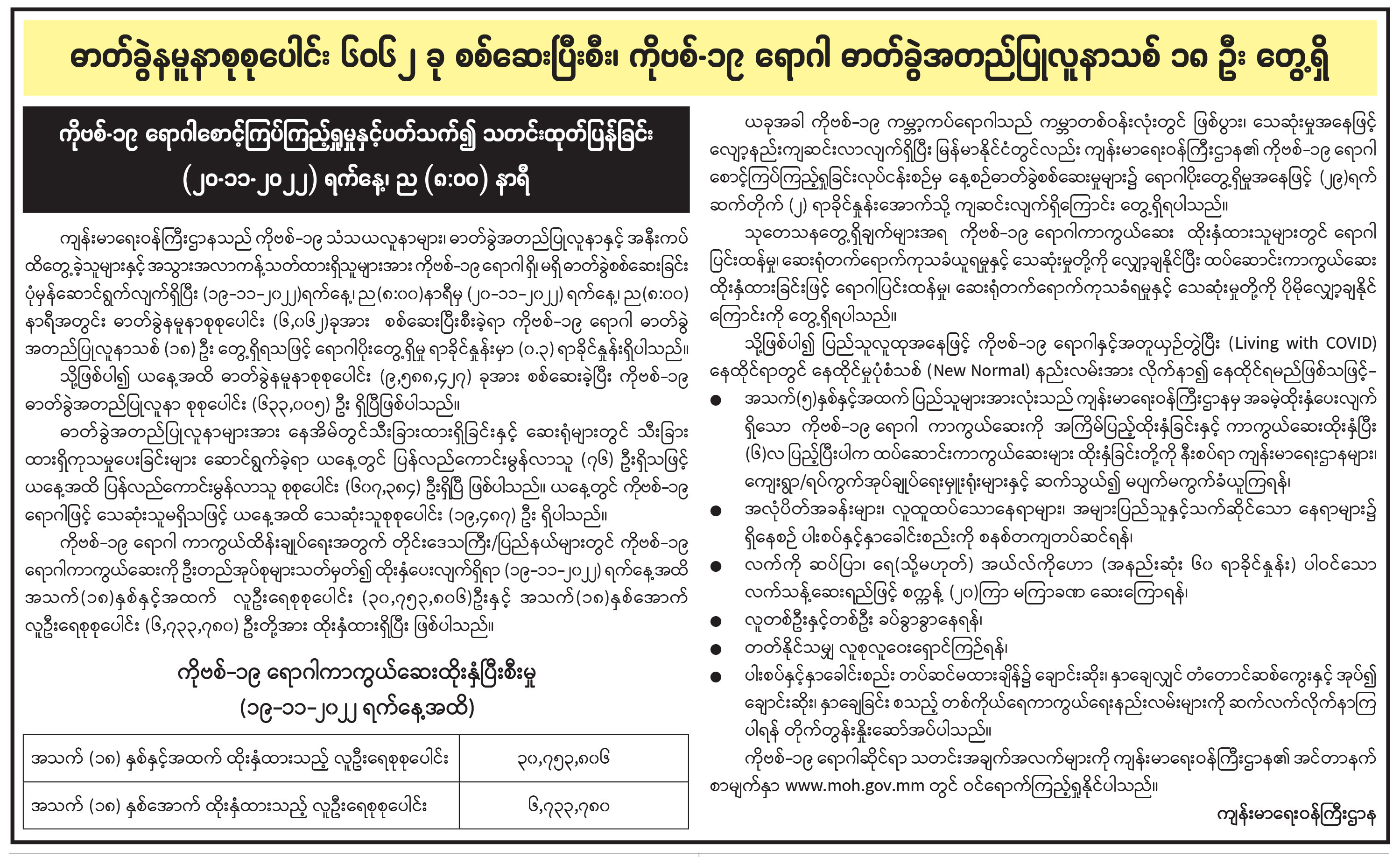 ဓာတ်ခွဲနမူနာစုစုပေါင်း ၆၀၆၂ ခု စစ်ဆေးပြီးစီး၊ ကိုဗစ်-၁၉ ရောဂါ ဓာတ်ခွဲအတည်ပြုလူနာသစ် ၁၈ ဦး တွေ့ရှိ