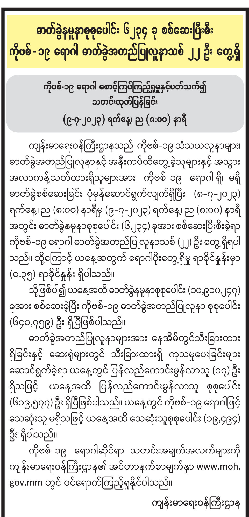 ဓာတ်ခွဲနမူနာစုစုပေါင်း ၆၂၃၄ ခု စစ်ဆေးပြီးစီး ကိုဗစ်-၁၉ ရောဂါ ဓာတ်ခွဲအတည်ပြုလူနာသစ် ၂၂ ဦး တွေ့ရှိ