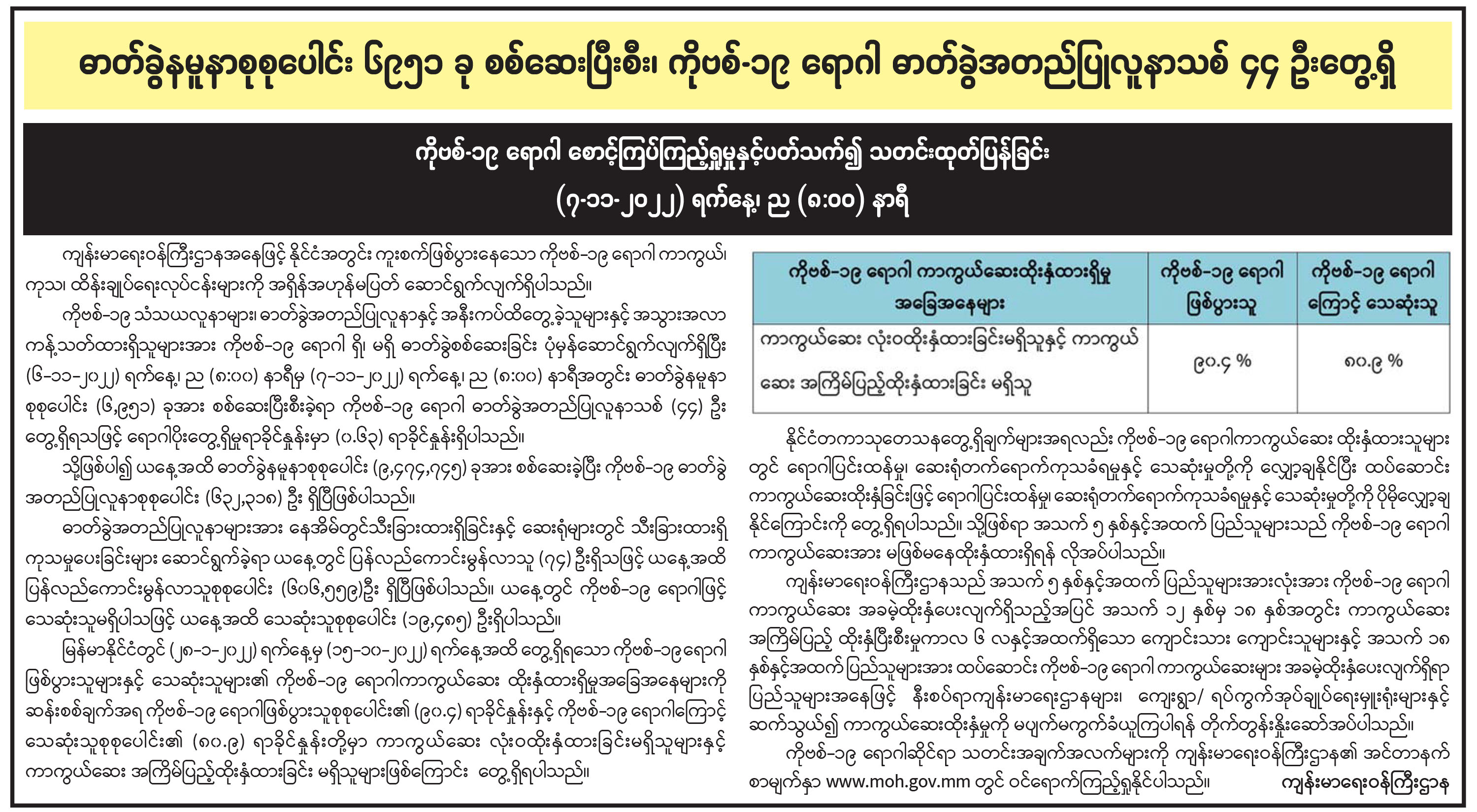 ဓာတ်ခွဲနမူနာစုစုပေါင်း ၆၉၅၁ ခု စစ်ဆေးပြီးစီး၊ ကိုဗစ်-၁၉ ရောဂါ ဓာတ်ခွဲအတည်ပြုလူနာသစ် ၄၄ ဦးတွေ့ရှိ
