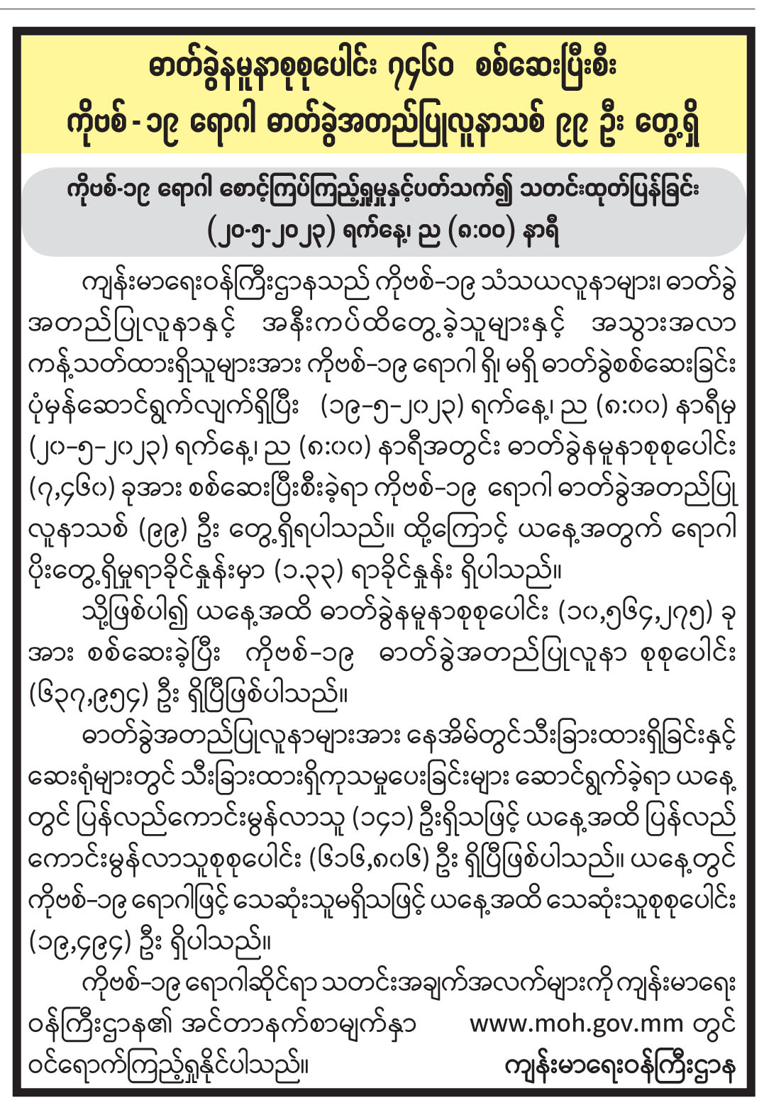 ဓာတ်ခွဲနမူနာစုစုပေါင်း ၇၄၆၀ စစ်ဆေးပြီးစီး ကိုဗစ်-၁၉ ရောဂါ ဓာတ်ခွဲအတည်ပြုလူနာသစ် ၉၉ ဦး တွေ့ရှိ