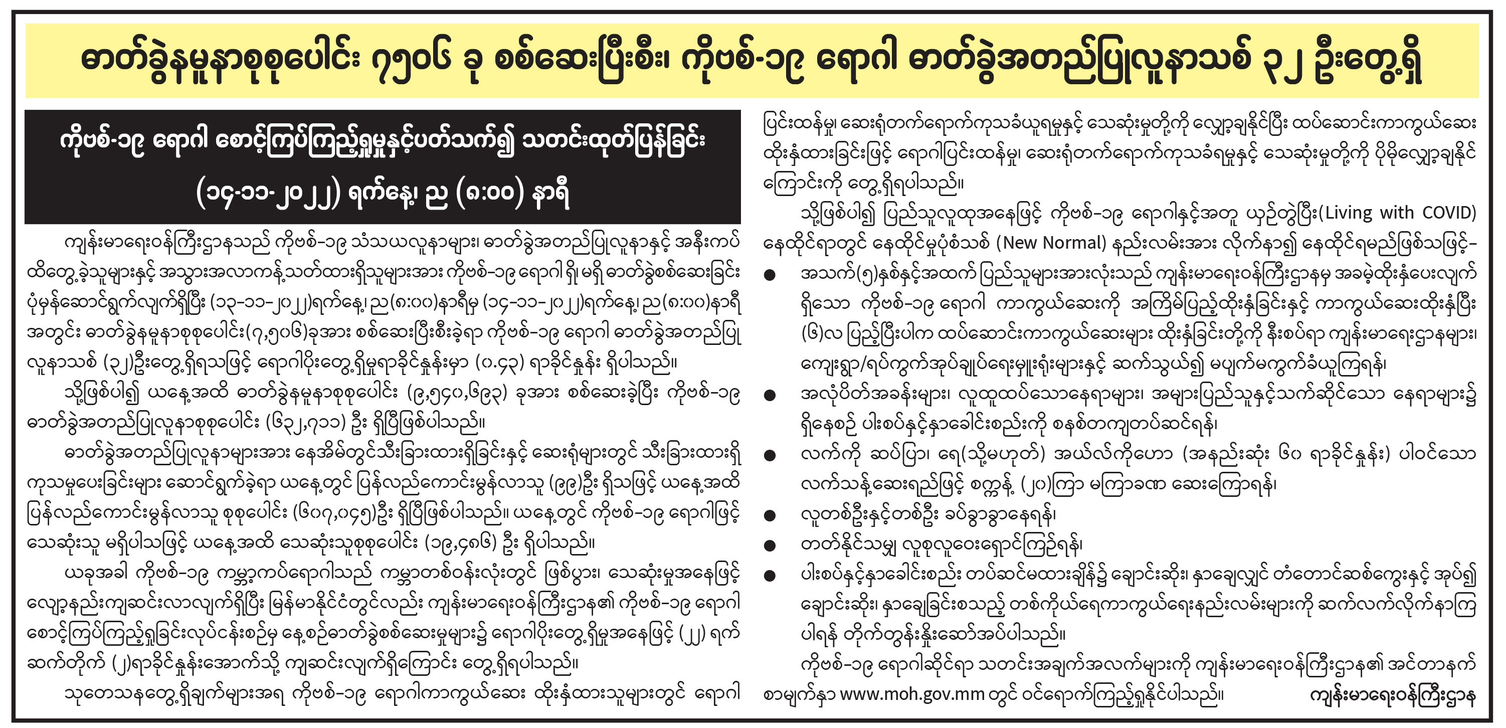 ဓာတ်ခွဲနမူနာစုစုပေါင်း ၇၅၀၆ ခု စစ်ဆေးပြီးစီး၊ ကိုဗစ်-၁၉ ရောဂါ ဓာတ်ခွဲအတည်ပြုလူနာသစ် ၃၂ ဦးတွေ့ရှိ