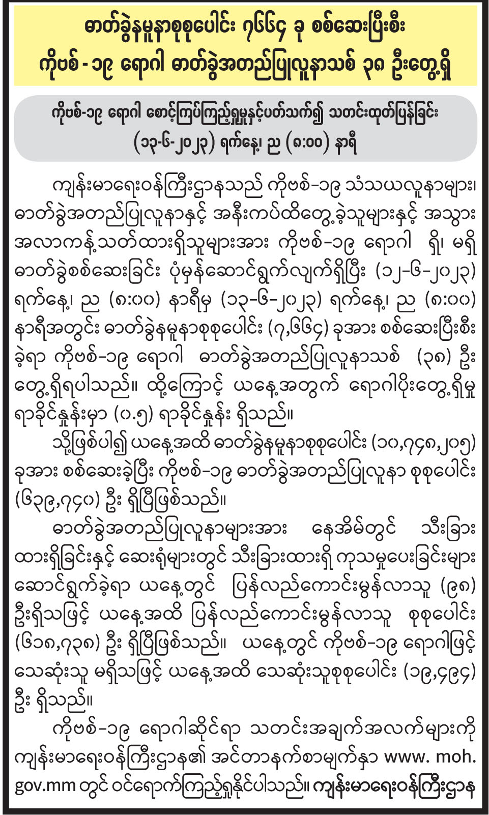ဓာတ်ခွဲနမူနာစုစုပေါင်း ၇၆၆၄ ခု စစ်ဆေးပြီးစီး ကိုဗစ်-၁၉ ရောဂါ ဓာတ်ခွဲအတည်ပြုလူနာသစ် ၃၈ ဦးတွေ့ရှိ