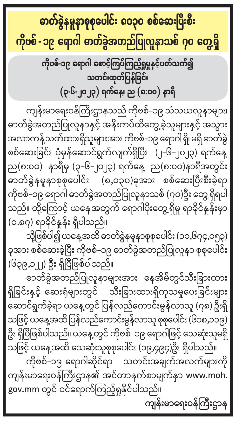 ဓာတ်ခွဲနမူနာစုစုပေါင်း ၈၀၃၀ စစ်ဆေးပြီးစီး ကိုဗစ်-၁၉ ရောဂါ ဓာတ်ခွဲအတည်ပြုလူနာသစ် ၇၀ တွေ့ရှိ