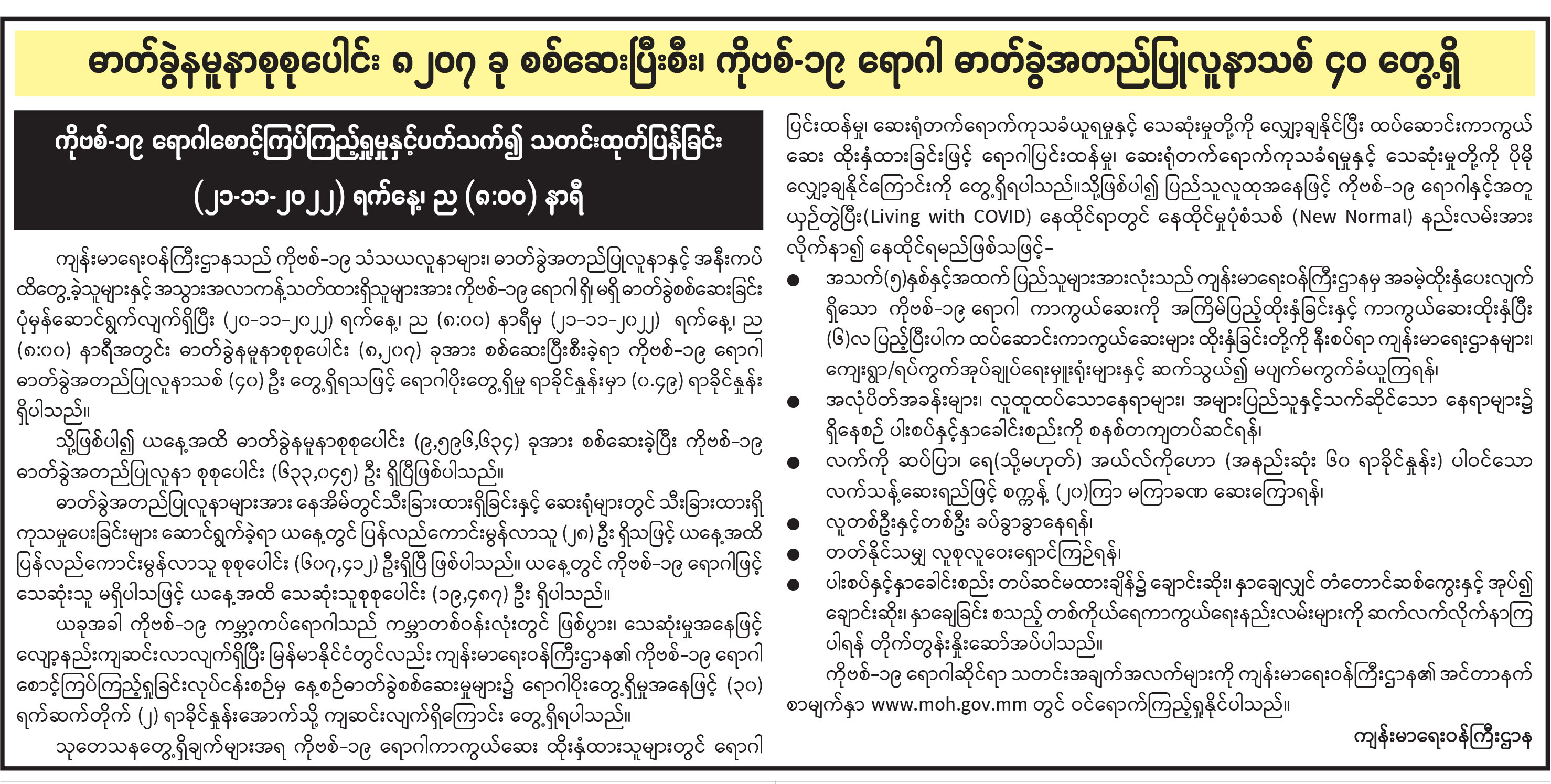 ဓာတ်ခွဲနမူနာစုစုပေါင်း ၈၂၀၇ ခု စစ်ဆေးပြီးစီး၊ ကိုဗစ်-၁၉ ရောဂါ ဓာတ်ခွဲအတည်ပြုလူနာသစ် ၄၀ တွေ့ရှိ