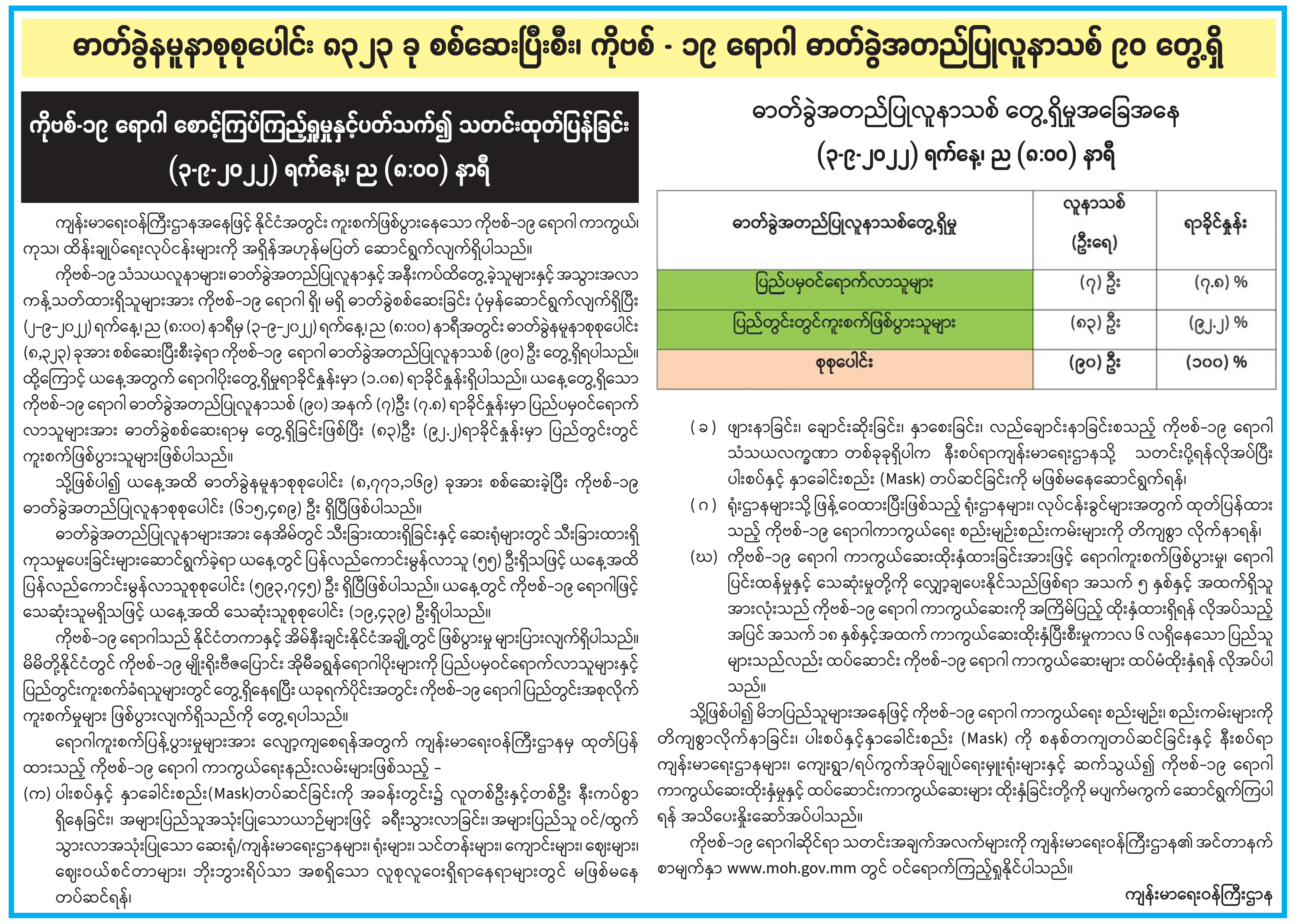 ဓာတ်ခွဲနမူနာစုစုပေါင်း ၈၃၂၃ ခု စစ်ဆေးပြီးစီး၊ ကိုဗစ်-၁၉ ရောဂါ ဓာတ်ခွဲအတည်ပြုလူနာသစ် ၉၀ တွေ့ရှိ