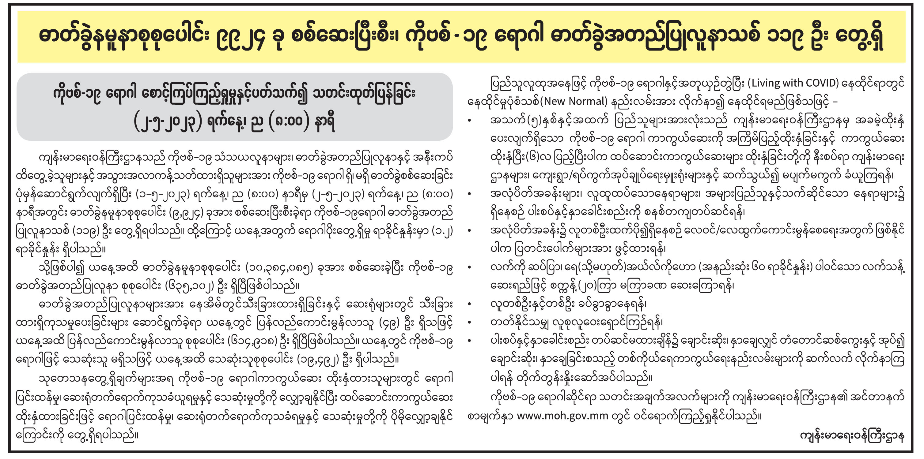 ဓာတ်ခွဲနမူနာစုစုပေါင်း ၉၉၂၄ ခု စစ်ဆေးပြီးစီး၊ ကိုဗစ်-၁၉ ရောဂါ ဓာတ်ခွဲအတည်ပြုလူနာသစ် ၁၁၉ ဦး တွေ့ရှိ