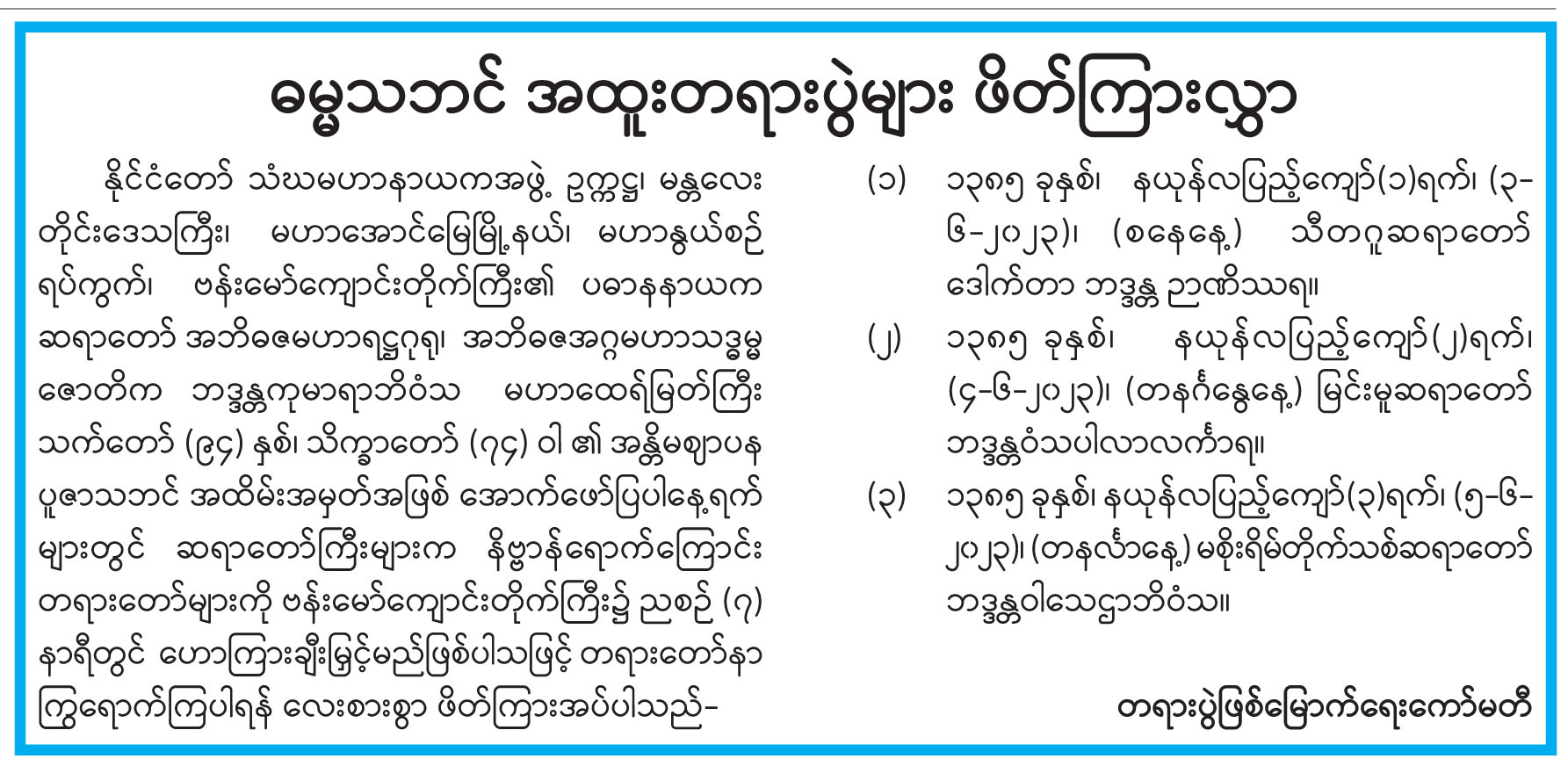 ဓမ္မသဘင် အထူးတရားပွဲများ ဖိတ်ကြားလွှာ