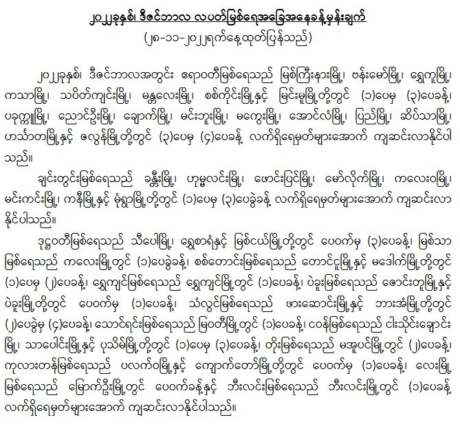 မိုးလေဝသနှင့်ဇလဗေဒညွှန်ကြားမှုဦးစီးဌာနမှ ၂၀၂၂ ခုနှစ်၊ ဒီဇင်ဘာလ လပတ်အတွက် မြစ်ရေအခြေအနေခန့်မှန်းချက်များကို (၂၈.၁၁.၂၀၂၂) ရက်နေ့တွင် အောက်ပါအတိုင်း ထုတ်ပြန်ထားပါတယ်…