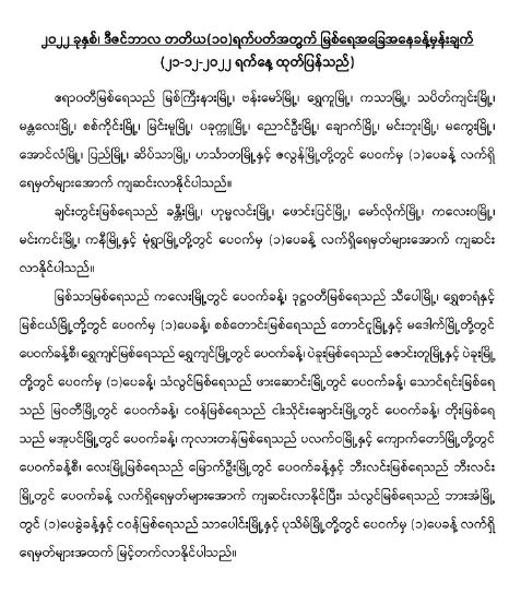 မိုးလေဝသနှင့်ဇလဗေဒညွှန်ကြားမှုဦးစီးဌာနမှ ၂၀၂၂ ခုနှစ်၊ ဒီဇင်ဘာလ တတိယ(၁၀)ရက်ပတ်အတွက် မြစ်ရေအခြေအနေခန့်မှန်းချက်ကို (၂၁.၁၂.၂၀၂၂) ရက်နေ့တွင် အောက်ပါအတိုင်း ထုတ်ပြန်ထားပါတယ်