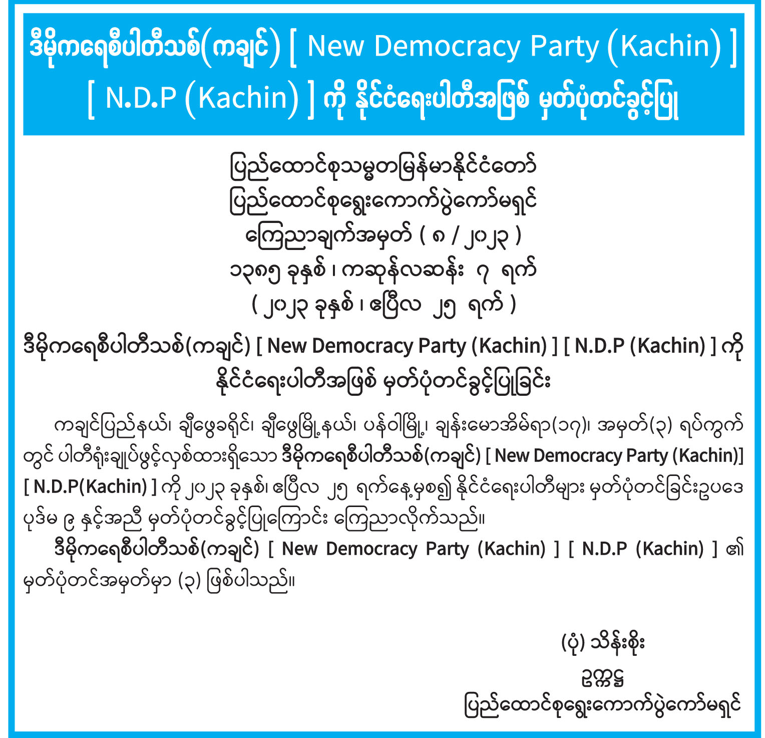ဒီမိုကရေစီပါတီသစ်(ကချင်) (New Democracy Party(Kachin)) (N.D.P (Kachin)) ကို နိုင်ငံရေးပါတီအဖြစ် မှတ်ပုံတင်ခွင့်ပြု