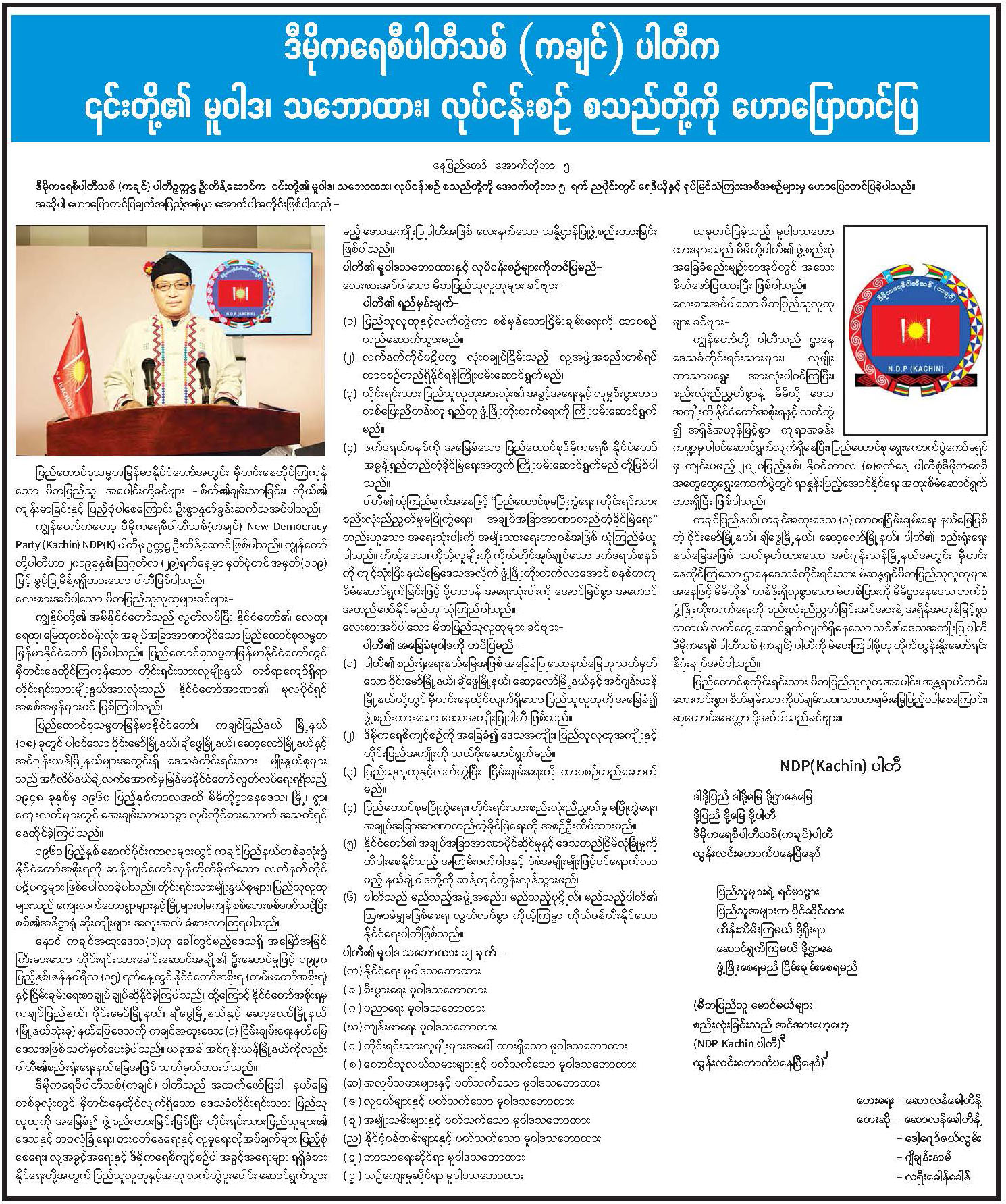 ဒီမိုကရေစီပါတီသစ်(ကချင်)ပါတီက ၎င်းတို့၏ မူဝါဒ၊ သဘောထား၊ လုပ်ငန်းစဉ် စသည်တို့ကို ဟောပြောတင်ပြ