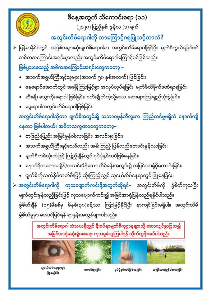 မြန်မာနိုင်ငံတွင် အဖြစ်အများဆုံးမျက်စိရောဂါမှာ အတွင်းတိမ်ရောဂါဖြစ်ပြီး မျက်စိကွယ်ရခြင်း၏ အဓိကအကြောင်းအရင်းမှာလည်း အတွင်းတိမ်ရောဂါကြောင့်ပင်ဖြစ်သည်။