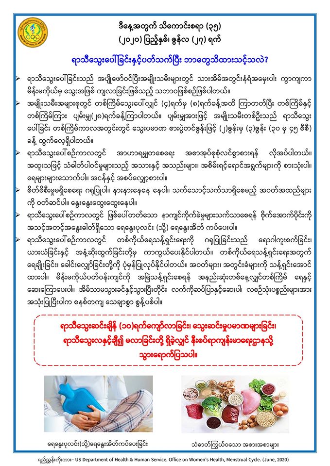 - ရာသီသွေးပေါ်စဉ်ကာလတွင် အာဟာရမျှတစေရေး အစာအုပ်စုစုံလင်စွာစားရန် လိုအပ်ပါတယ်။ အထူးသဖြင့် သံဓါတ်ပါဝင်မှုများသည့် အသားနှင့် အသည်းများ၊ အစိမ်းရင့်ရောင်အရွက်များကို စားသုံးပါ။ ရေများများသောက်ပါ။ အငန်နှင့် အစပ်လျှော့စားပါ။