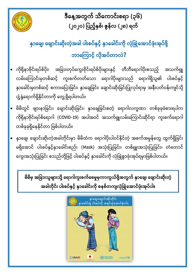 "မိမိမှ အခြားသူများသို့ ရောဂါကူးစက်စေမှုမှကာကွယ်ဖို့အတွက် နှာချေ၊ ချောင်းဆိုးတဲ့ အခါတိုင်း ပါးစပ်နှင့် နှာခေါင်းကို စနစ်တကျလုံခြုံအောင်ဖုံးအုပ်ပါ။"