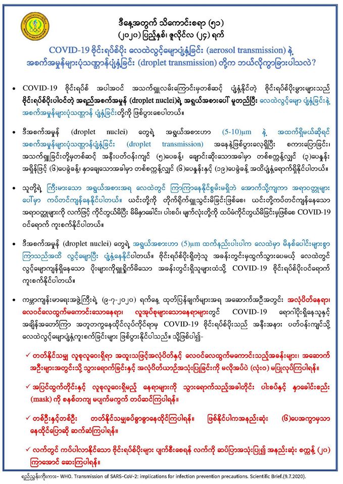 • ကမ္ဘာကျန်းမာရေးအဖွဲ့ကြီးရဲ့ (၉-၇-၂၀၂၀) ရက်နေ့ ထုတ်ပြန်ချက်များအရ အဆောက်အဦအတွင်း အလုံပိတ်နေရာ၊ လေဝင်လေထွက်မကောင်းသောနေရာ၊ လူအုပ်စုများသောနေရာများတွင် COVID-19 ရောဂါပိုးရှိနေသူနှင့် အချိန်အတော်ကြာ အတူတကွနေထိုင်လုပ်ကိုင်ရာမှ COVID-19 ဗိုင်းရပ်စ်ပိုးသည် အနီးအနား ပတ်ဝန်းကျင်သို့ လေထဲလွင့်မျောပျံ့နှံ့ကူးစက်ခြင်းများ ဖြစ်ပွားနိုင်ပါသည်။