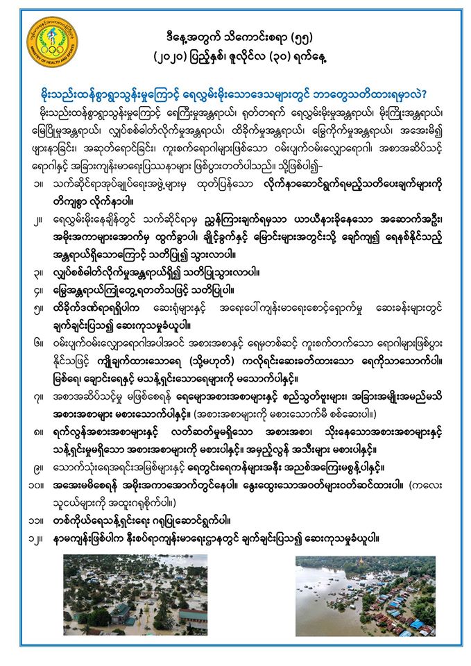 ၂။ ရေလွှမ်းမိုးနေချိန်တွင် သက်ဆိုင်ရာမှ ညွှန်ကြားချက်ရမှသာ ယာယီနားခိုနေသော အဆောက်အဦး၊ အမိုးအကာများအောက်မှ ထွက်ခွာပါ၊ ချိုင့်ခွက်နှင့် မြောင်းများအတွင်းသို့ ချော်ကျ၍ ရေနစ်နိုင်သည့် အန္တရာယ်ရှိသောကြောင့် သတိပြု၍ သွားလာပါ။
