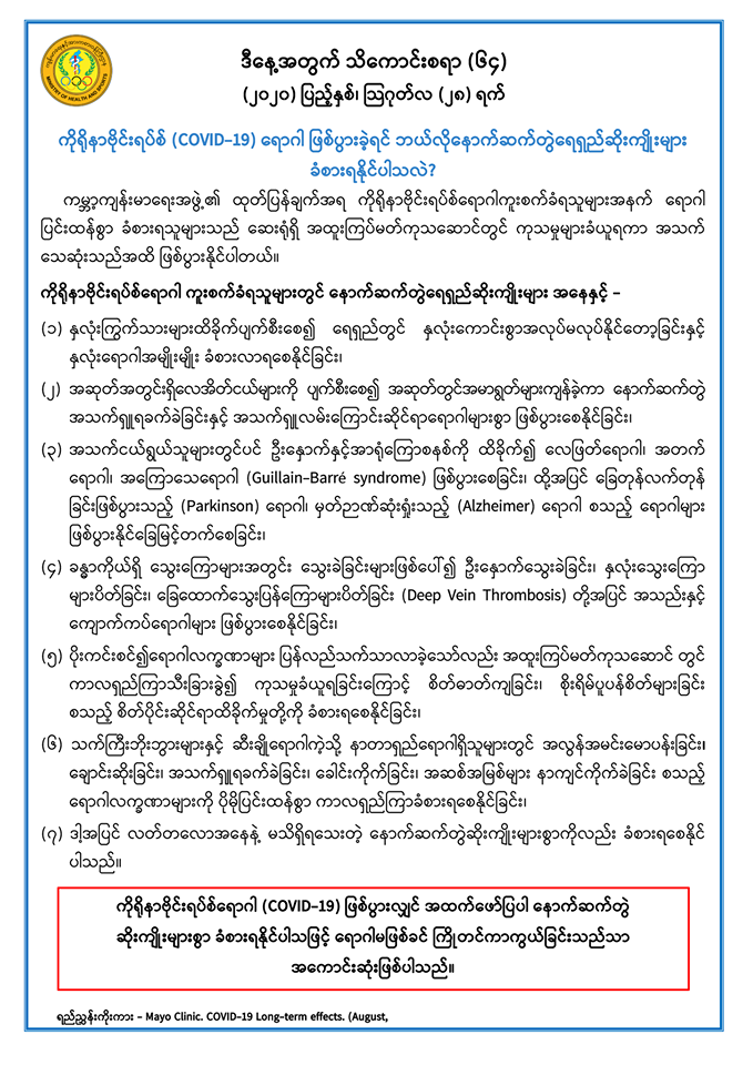 ကိုရိုနာဗိုင်းရပ်စ် (COVID-19) ရောဂါ ဖြစ်ပွားခဲ့ရင် ဘယ်လိုနောက်ဆက်တွဲရေရှည်ဆိုးကျိုးများ
