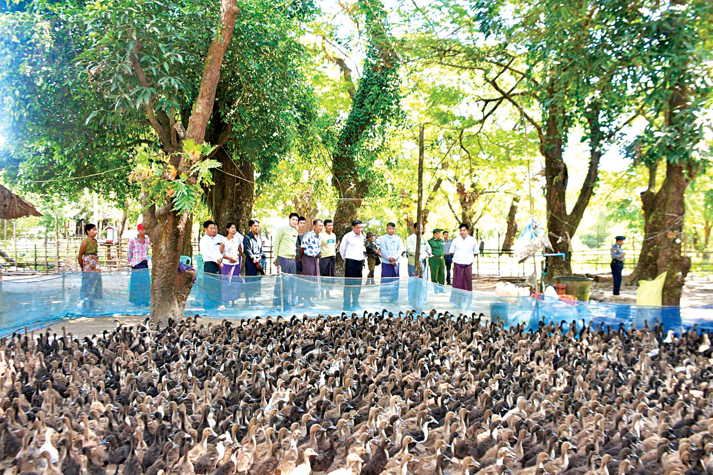 ယင်းနောက် ဒိုက်ဦးမြို့နယ် ပျဉ်းမလွင် ကျေးရွာ၌ နိုင်ငံ့စီးပွားမြှင့်တင်ရေး ရန်ပုံငွေဖြင့် အောင်မြင်စွာ မွေးမြူရေးလုပ်ငန်း ဆောင်ရွက်လျက်ရှိသော ဦးဇော်လွင်၏ ကာကီကင်းမျိုး ဥစားဘဲကောင်ရေ ၇၀၀၀ မွေးမြူထားရှိမှုကိုလည်းကောင်း၊ လက်ခုပ်ကွင်းကျေးရွာ၌ နိုင်ငံ့စီးပွားမြှင့်တင်ရေး ရန်ပုံငွေဖြင့် ဒေသကြက် ၁၀၀၀၀နှင့် ဥစားဘဲကောင်ရေ ၅၀၀၀ မွေးမြူထားရှိမှုနှင့် တိရစ္ဆာန်အစာအဖြစ် ရေကျောက်ခက် မွေးမြူရေးကန်များ ဆောင်ရွက်ထားရှိမှုကိုလည်းကောင်း ကြည့်ရှုအားပေးသည်။