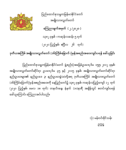 ပြည်ထောင်စုသမ္မတမြန်မာနိုင်ငံတော် ဖွဲ့စည်းပုံအခြေခံဥပဒေပုဒ်မ ၁၅၅၊ ၂၀၁၂ ခုနှစ်၊ အမျိုးသားလွှတ်တော်ဆိုင်ရာ ဥပဒေပုဒ်မ ၃၅ နှင့် ၂၀၁၅ ခုနှစ်၊ အမျိုးသားလွှတ်တော်ဆိုင်ရာ နည်းဥပဒေများ၏ နည်းဥပဒေ ၃၊ နည်းဥပဒေခွဲ(ခ)တို့အရ ဒုတိယအကြိမ် အမျိုးသားလွှတ်တော် (၁၆)ကြိမ်မြောက်ပုံမှန်အစည်းအဝေးကို နေပြည်တော်၌ ၁၃၈၂ ခုနှစ်၊ ကဆုန်လပြည့်ကျော် ၁၂ ရက် (၂၀၂၀ ပြည့်နှစ်၊ မေလ ၁၈ ရက်) တနင်္လာနေ့၊ နံနက် (၁၀)နာရီ အချိန်တွင် စတင်ကျင်းပရန် ခေါ်ယူကြောင်း ကြေညာအပ်ပါသည်။