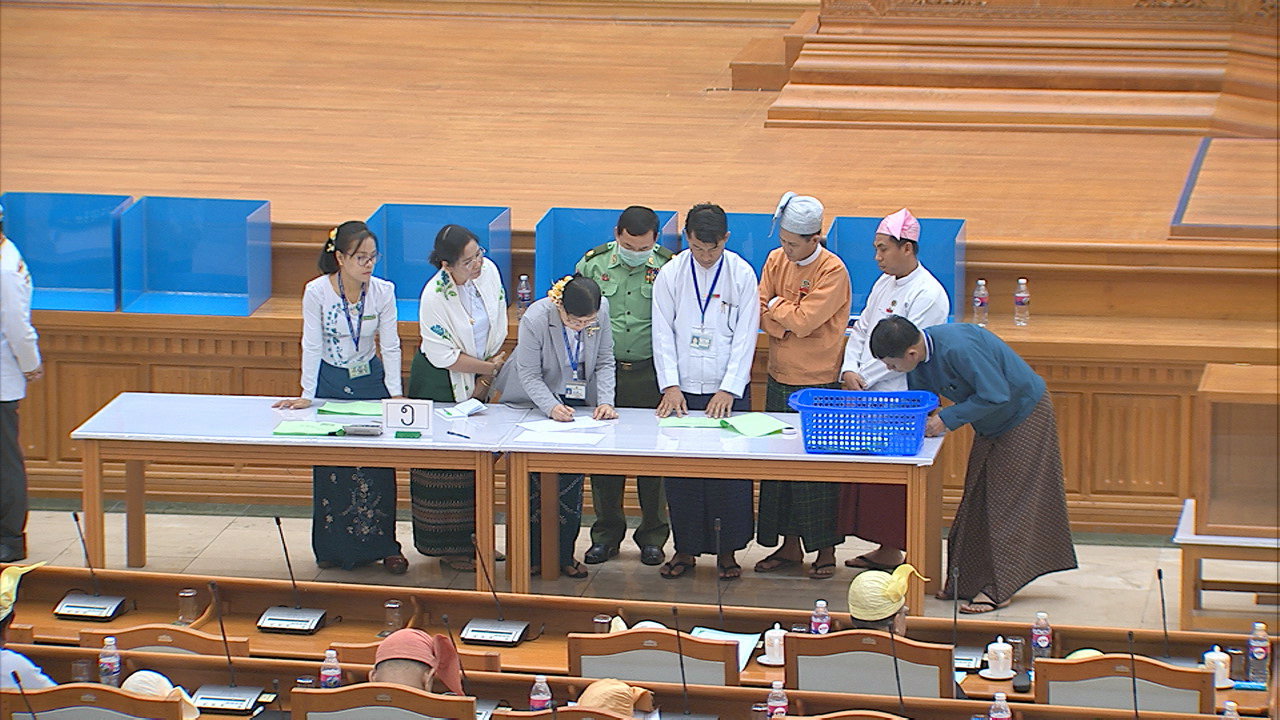 ယင်းနောက် အမျိုးသားလွှတ်တော် ဥက္ကဋ္ဌ မန်းဝင်းခိုင်သန်း၊ ပြည်ထောင်စုလွှတ်တော် ဒုတိယနာယက ဦးထွန်းအောင် (ခ) ဦးထွန်းထွန်းဟိန်၊ အမျိုးသားလွှတ်တော် ဒုတိယဥက္ကဋ္ဌ ဦးအေးသာအောင်နှင့် ပြည်ထောင်စုလွှတ်တော် ကိုယ်စားလှယ်များက သတ်မှတ်နေရာတွင် လျှို့ဝှက်ဆန္ဒပြုခြင်း နည်းလမ်းဖြင့် ဆန္ဒမဲပေးကြသည်။