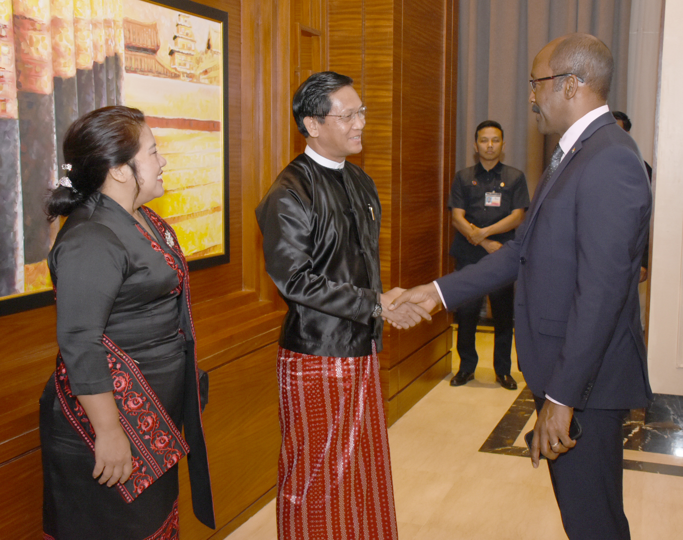 ညစာစားပွဲသို့ တက်ရောက်လာကြသည့် ဆေးရှဲလ်နိုင်ငံ ဒုတိယသမ္မတနှင့်ဇနီး ဦးဆောင်သည့် ကိုယ်စားလှယ်အဖွဲ့ဝင်များကို ဒုတိယသမ္မတ ဦးဟင်နရီဗန်ထီးယူနှင့် ဇနီး ဒေါက်တာရွှေလွှမ်းတို့က ရင်းရင်းနှီးနှီး ကြိုဆိုနှုတ်ဆက်သည်။