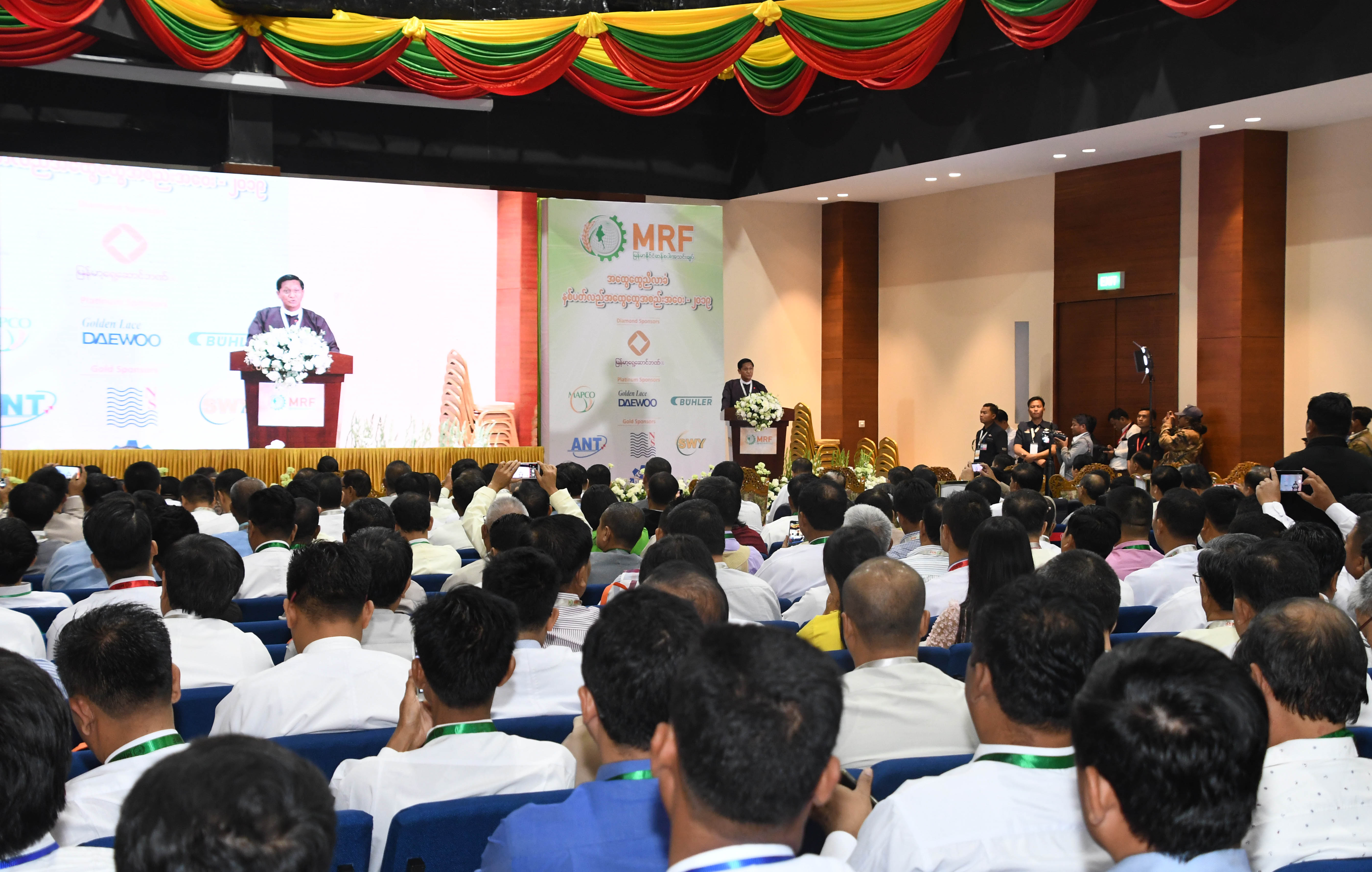 မြန်မာနိုင်ငံဆန်စပါးအသင်းချုပ်က ဦးဆောင်ကျင်းပသည့် မြန်မာ့ဆန်စပါးကဏ္ဍ ဖွံ့ဖြိုးတိုးတက်ရေးဆိုင်ရာဆွေးနွေးပွဲ၊ မြန်မာနိုင်ငံဆန်စပါးအသင်းချုပ်၏ အထွေထွေညီလာခံနှင့် နှစ်ပတ်လည်အထွေထွေ အစည်းအဝေးများ၏  ဖွင့်ပွဲအခမ်းအနားကို ယနေ့ နံနက်  ၉ နာရီတွင် မန္တလေးမြို့ရှိ မန္တလေးကွန်ဗင်းရှင်းစင်တာ၌ ကျင်းပရာ  တောင်သူလယ်သမားအခွင့်အရေး ကာကွယ်ရေးနှင့် အကျိုးစီးပွားမြှင့်တင်ရေး ဦးဆောင်အဖွဲ့၏ အဖွဲ့ခေါင်းဆောင်