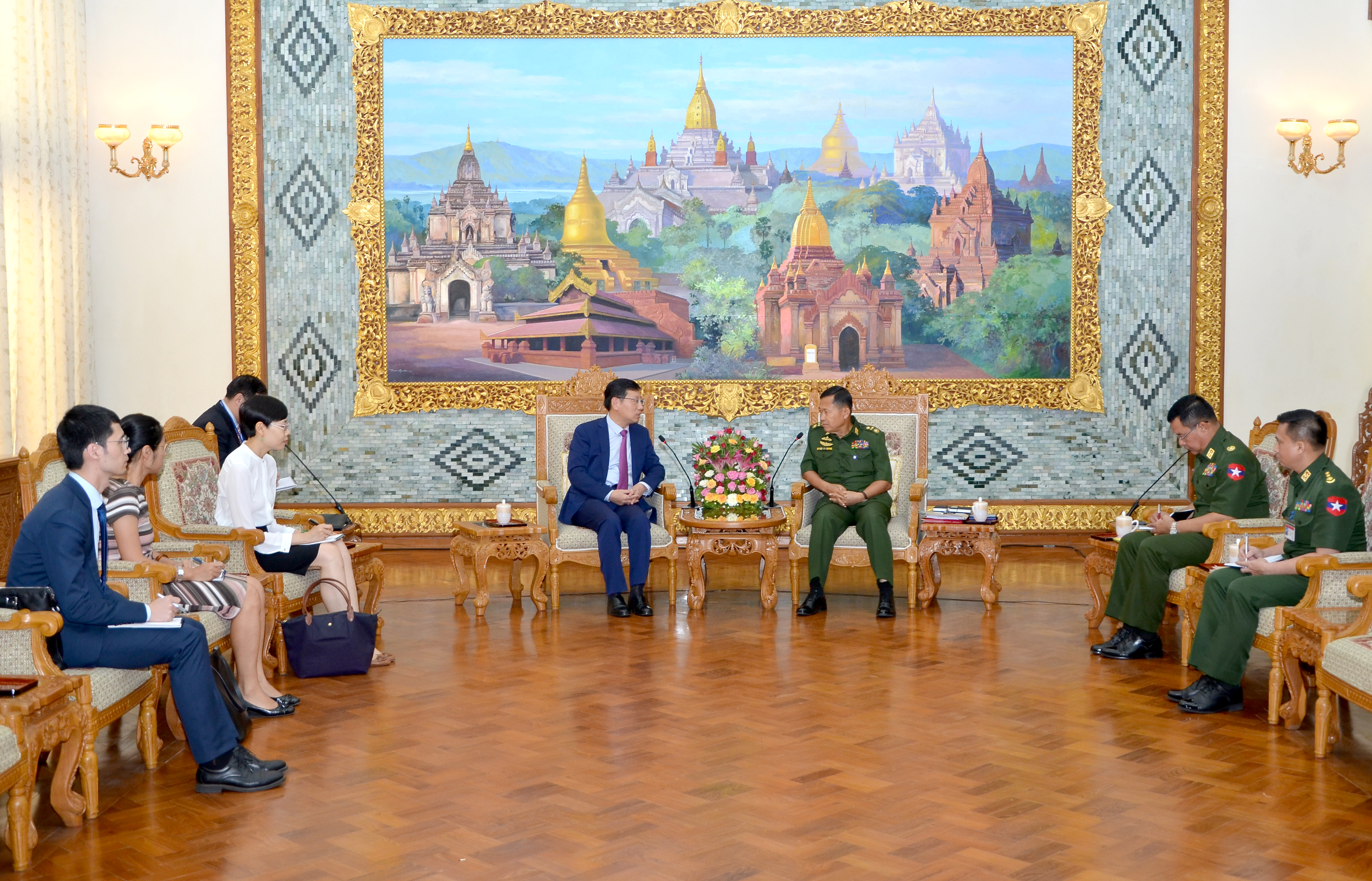 ဒုတိယတပ်မတော်ကာကွယ်ရေးဦးစီးချုပ် ကာကွယ်ရေးဦးစီးချုပ်(ကြည်း) ဒုတိယဗိုလ်ချုပ်မှူးကြီး စိုးဝင်းသည် မြန်မာနိုင်ငံဆိုင်ရာ တရုတ်ပြည်သူ့သမ္မတနိုင်ငံ သံအမတ်ကြီး ဟုန်လျန်ဦးဆောင်သော ကိုယ်စားလှယ်အဖွဲ့အား ယနေ့ညနေပိုင်းတွင် နေပြည်တော်ရှိ  ဘုရင့်နောင်ရိပ်သာ ဧည့်ခန်းမဆောင်၌ လက်ခံတွေ့ဆုံသည်။