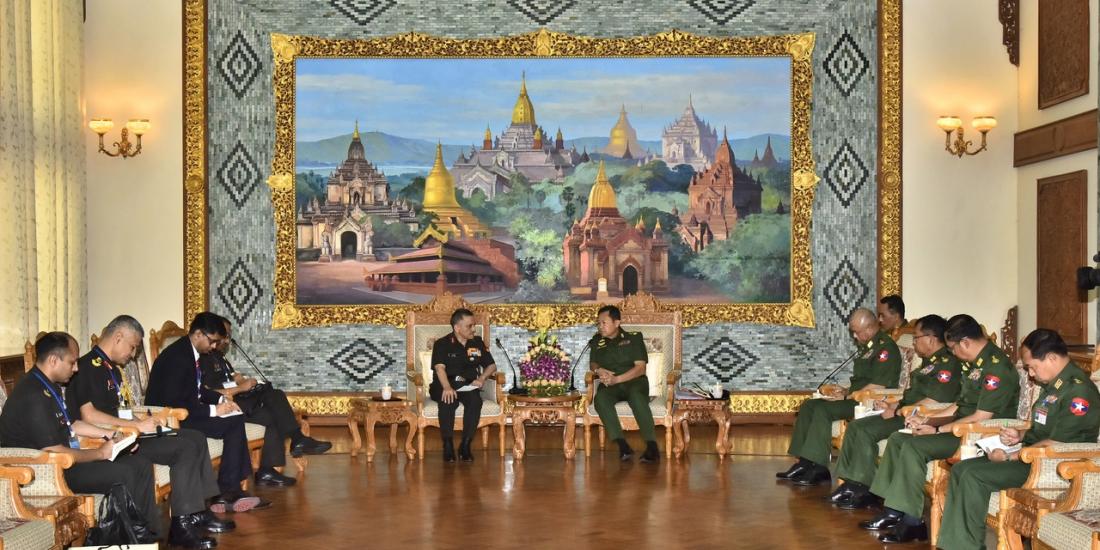 ဒုတိယတပ်မတော်ကာကွယ်ရေးဦးစီးချုပ် ကာကွယ်ရေးဦးစီးချုပ်(ကြည်း) ဒုတိယဗိုလ်ချုပ်မှူးကြီး စိုးဝင်းသည် အိန္ဒိယကြည်းတပ် စစ်ဆင်ရေးညွှန်ကြားရေးမှူးချုပ် (Director General of Military Operations- DGMO), Lieutenant General Anil Chauhan အား ယနေ့နံနက်ပိုင်းတွင် နေပြည်တော်ရှိ ဘုရင့်နောင်ရိပ်သာ ဧည့်ခန်းမဆောင်၌ လက်ခံတွေ့ဆုံသည်။