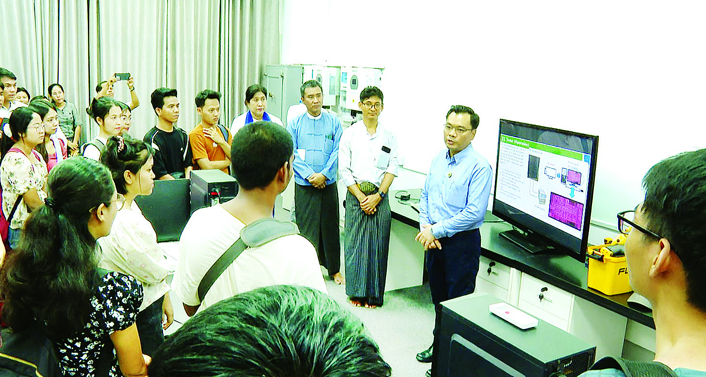 ထို့နောက် နေရောင်ခြည်အလင်းစွမ်းအင်သုံး လျှပ်စစ်ဓာတ်အား ထုတ်လုပ်ခြင်းဆိုင်ရာ သုတေသန ဓာတ်ခွဲခန်း၊ Myan-mar-Japan Technological Development Center-1 နှင့် Myanmar - Japan Technolo-gical Development Center-2 သို့ရောက်ရှိပြီး Polytechnic University (မအူပင်)၊ ရန်ကုန်အနောက်ပိုင်း နည်းပညာတက္ကသိုလ်၊ ပြည်နည်းပညာ တက္ကသိုလ်နှင့် နည်းပညာတက္ကသိုလ် (တောင်ငူ)တို့မှ Internship ဆင်းနေကြသော ကျောင်းသား၊ ကျောင်းသူများနှင့်တွေ့ဆုံ၍ နေရောင်ခြည် စွမ်းအင် သုံးလျှပ်စစ်ဓာတ်အား ထုတ်လုပ်ခြင်းမှာ အရေးကြီးကြောင်း၊ ဤ ဓာတ်ခွဲခန်းတွင် Solar ပြားများ၏ အရည်အသွေးနှင့် စွမ်းဆောင်ရည် များကို တိုင်းတာနိုင်ရန်အတွက် တည်ထောင်ထားခြင်း ဖြစ်ပြီး သေချာစွာလေ့လာကြရန် လိုအပ်ကြောင်း၊ အနာဂတ်စွမ်းအင်ကဏ္ဍတွင် ပြန်လည်ပြည့်ဖြိုးမြဲ စွမ်းအင် ကဏ္ဍသည် အရေးကြီးသည့် အခန်းကဏ္ဍမှ ပါဝင်လာမည်ဖြစ်သောကြောင့် ကြိုးစားဆောင်ရွက် သွားကြရန်မှာကြားပြီး လက်တွေ့ဆောင်ရွက်နေမှုများကို ကြည့်ရှုအားပေးသည်။