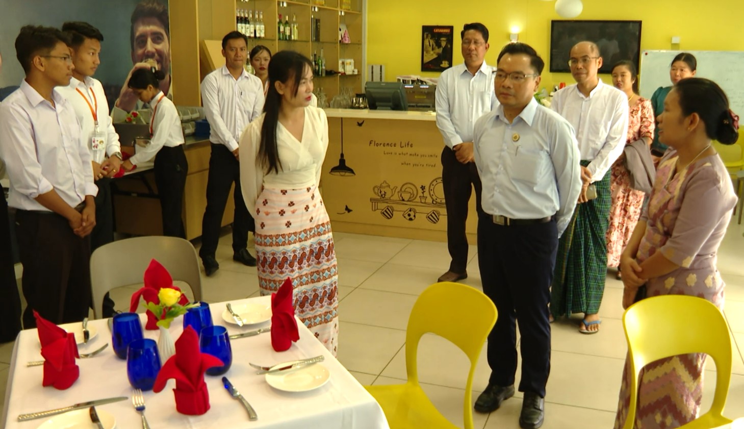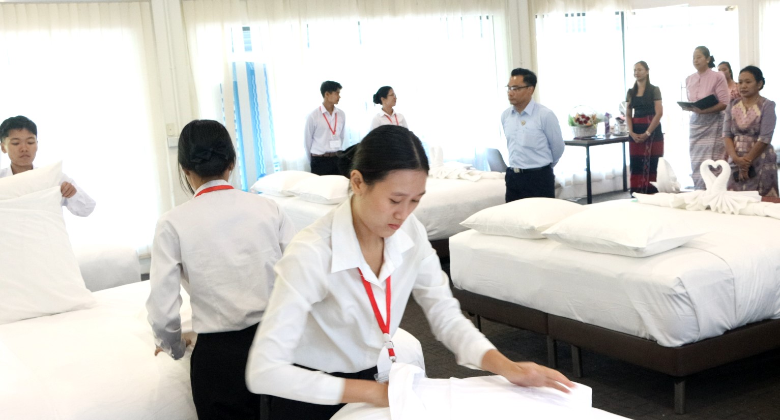 ယင်းနောက် ဒုတိယဝန်ကြီးသည် အင်ဂျင်နီယာဘာသာရပ်ဌာနများရှိ စာသင်ခန်းများ၊ အလုပ်ရုံများ၊ လက်တွေ့ခန်းများ၊ ဟိုတယ်နှင့် ခရီးသွားဘာသာရပ်သင်တန်းများတွင် ကျောင်းသား၊ ကျောင်းသူများက လက်တွေ့လေ့ကျင့်နေမှု အခြေအနေများကို ကြည့်ရှုအားပေးကာ နိုင်ငံတော်မှ လူငယ်များ၏ အလုပ်အကိုင်အခွင့်အလမ်းများ ထိရောက်မြန်ဆန်စွာ ဖန်တီးပေးနိုင်ရေး မွန်မြတ်လှသော အခမဲ့အသက်မွေးကျောင်း သင်တန်းများ ဖွင့်လှစ်ပေးကာ ပံ့ပိုးဆောင်ရွက်ပေးလျက်ရှိသည်ကို တန်ဖိုးထားလေ့ကျင့်ကြရန်နှင့် နိုင်ငံတော်အပေါ် ကျေးဇူးပြန်ဆပ်သည့်အနေဖြင့် ပြည်သူများကို အမှန်တကယ် အလုပ်အကျွေးပြုနိုင်သည့် ဗလငါးတန်နှင့် ပြည့်စုံသော လူငယ်ကောင်းများဖြစ်စေရေး ရည်မှန်းချက်ချမှတ်ပြီး ဆောင်ရွက်ကြရန် မှာကြားသည်။