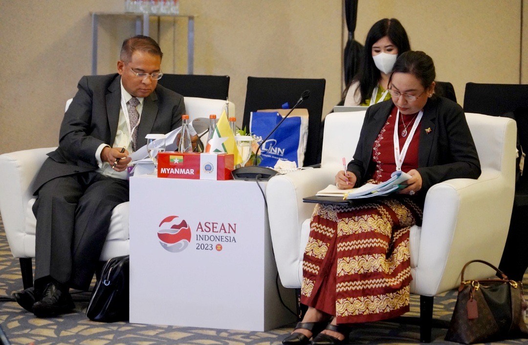 အာဆီယံအသိုက်အဝန်း ၂၀၂၅ ခုနှစ်အလွန် မျှော်မှန်းချက်ရေးဆွဲရေးဆိုင်ရာ မြန်မာအ ဆင့်မြင့်ကိုယ်စားလှယ် ရင်းနှီးမြှုပ်နှံမှုနှင့် နိုင်ငံခြားစီးပွားဆက်သွယ်ရေး ဝန်ကြီးဌာန ဒုတိယဝန် ကြီး ဒေါက်တာဝါဝါမောင် ဦးဆောင်သည့် ကိုယ်စားလှယ်အဖွဲ့သည် အင်ဒိုနီးရှားနိုင်ငံ ဂျကာတာ မြို့တွင် ၂၀၂၃ ခုနှစ် ဇွန် ၂၆ ရက်မှ ၂၇ ရက်အထိ ကျင်းပပြုလုပ်ခဲ့သည့် အာဆီယံအသိုက်အဝန်း ၂၀၂၅ ခုနှစ်အလွန် မျှော်မှန်းချက်ရေးဆွဲရေးဆိုင်ရာ အဆင့်မြင့်လုပ်ငန်းအဖွဲ့၏ (၈)ကြိမ်မြောက် အစည်းအဝေးသို့ တက်ရောက်ခဲ့သည်။