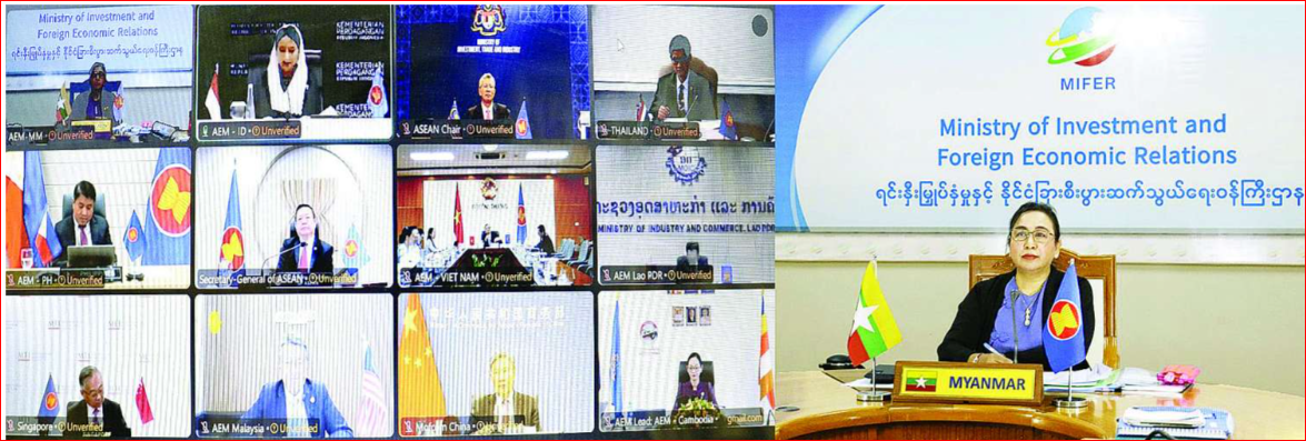 ရင်းနှီးမြှုပ်နှံမှုနှင့် နိုင်ငံခြားစီးပွားဆက်သွယ်ရေးဝန်ကြီးဌာန ဒုတိယဝန်ကြီး ဒေါက်တာဝါဝါမောင် ဦးဆောင်သည့်အဖွဲ့သည် ယမန်နေ့က ဗီဒီယိုကွန်ဖရင့်စနစ်ဖြင့်ကျင်းပသည့် အာဆီယံ-တရုတ် စီးပွားရေးဝန်ကြီးများ အထူးအစည်းအဝေး၊ အာဆီယံ-ဩစတြေးလျ-နယူးဇီလန် စီးပွားရေးဝန်ကြီးများ အထူးအစည်းအဝေးနှင့် အာဆီယံ-ဂျပန် စီးပွားရေးဝန်ကြီးများ အထူးအစည်းအဝေးတို့ကို တက်ရောက် သည်။