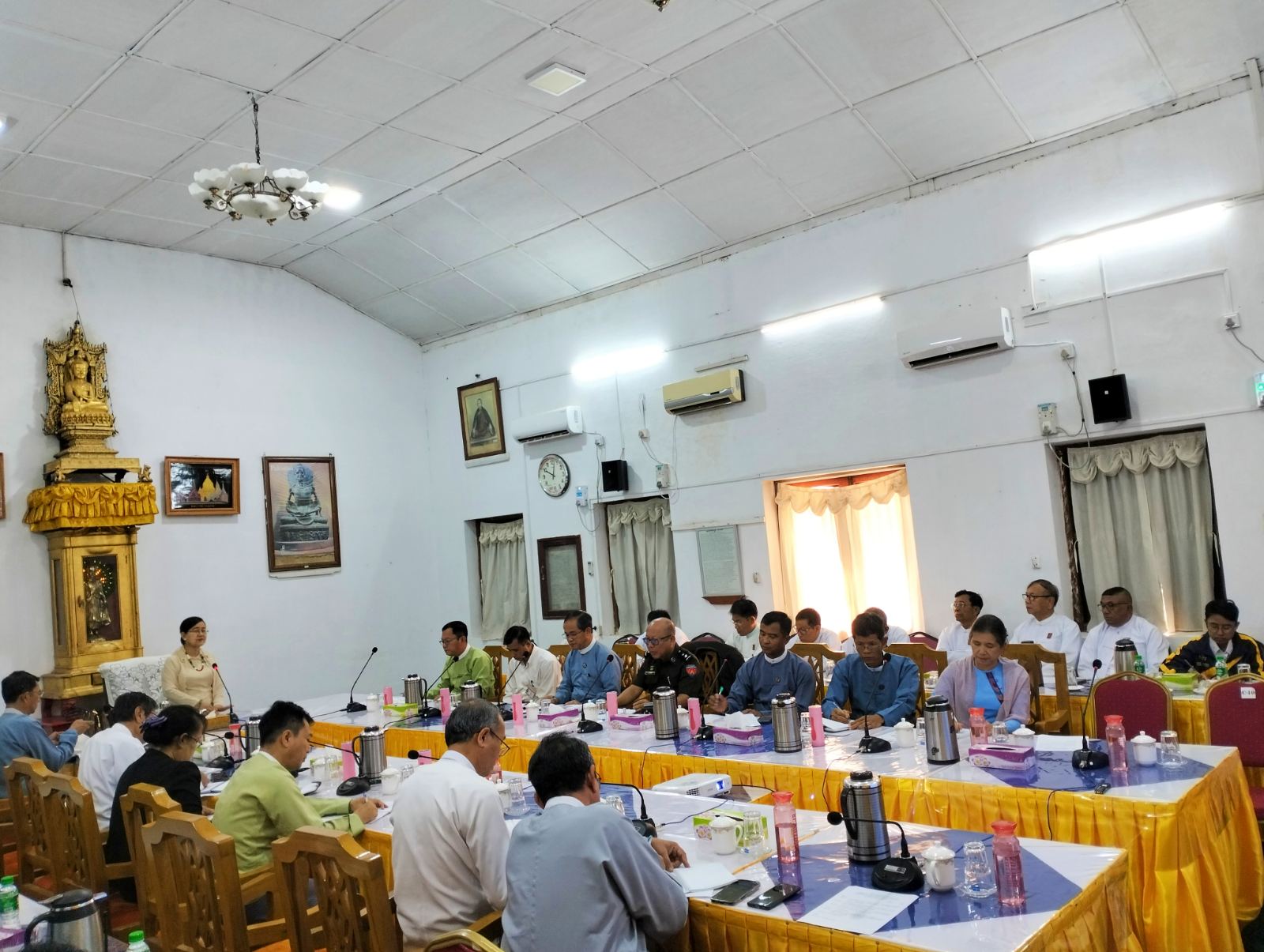 သာသနာရေးနှင့်ယဉ်ကျေးမှုဝန်ကြီးဌာန ဒုတိယဝန်ကြီးဒေါ်နုမြဇံသည် ယမန်နေ့ နံနက်ပိုင်းက ရွှေစည်းခုံစေတီတော်ဂေါပကရုံး၌ ကျင်းပသည့် ရွှေစည်းခုံစေတီတော်ပြုပြင်ထိန်းသိမ်းရေး ဘက်စုံ လွှမ်းခြုံသောအစီအစဉ်(Master Plan( ရေးဆွဲနိုင်ရေး လုပ်ငန်းညှိနှိုင်းအစည်းအဝေးသို့ တက်ရောက်သည်။