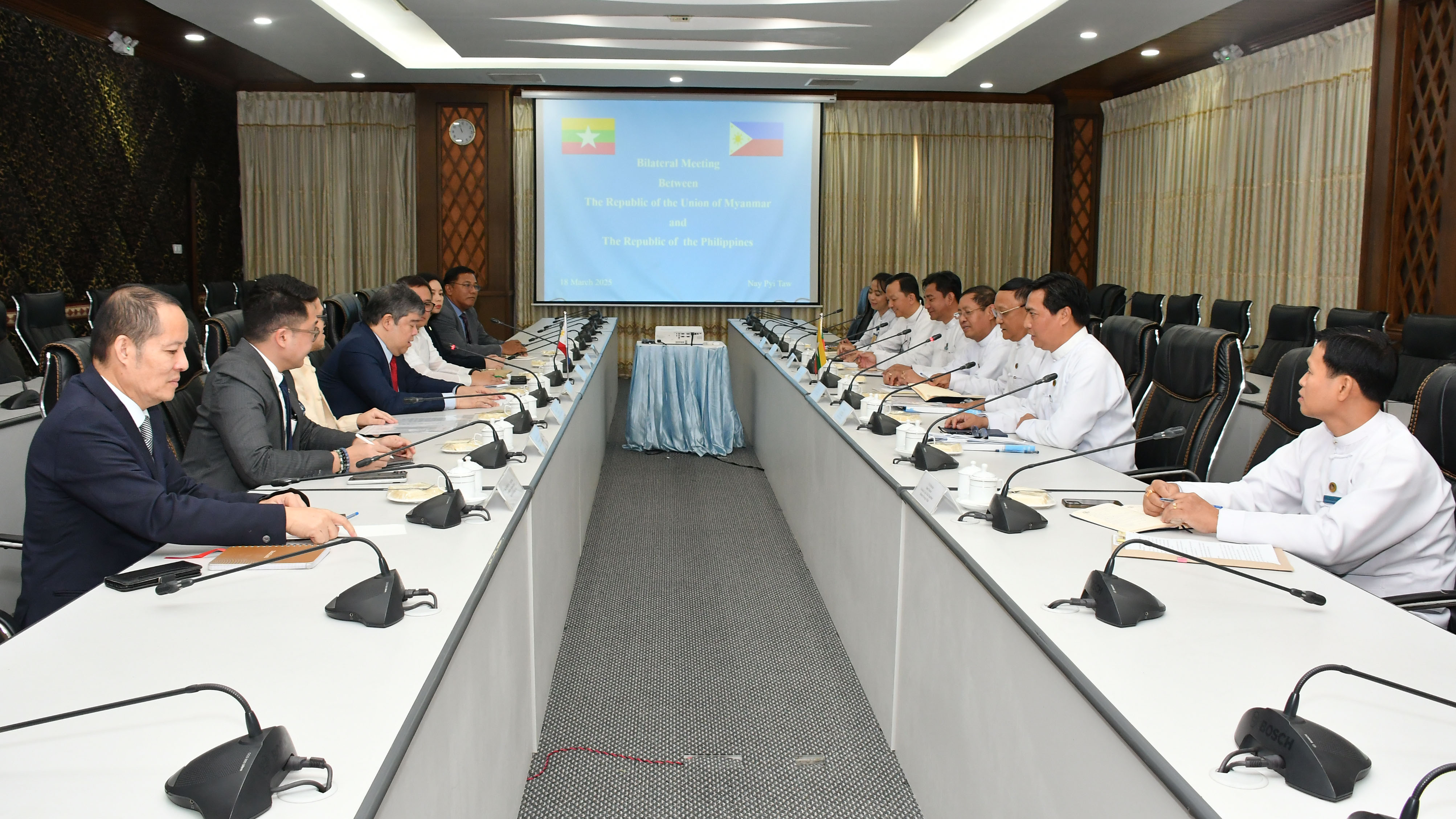 နိုင်ငံခြားရေးဝန်ကြီးဌာန၊ ဒုတိယဝန်ကြီး ဦးကိုကိုကျော်သည် ဖိလစ်ပိုင်နိုင်ငံခြားရေးဝန်ကြီး ဌာန၊ ဒုတိယဝန်ကြီး H.E. Mr. Eduardo Jose A.De Vega (Deputy Foreign Minister, Undersecretary for Migrant Workers’ Affairs, Department of Foreign Affairs) ဦးဆောင်သော ကိုယ်စားလှယ်အဖွဲ့အား ယနေ့နံနက် ၁၁ နာရီတွင်နေပြည်တော်ရှိ နိုင်ငံခြားရေး ဝန်ကြီးဌာန၊ ဧရာဝတီခန်းမ၌ လက်ခံတွေ့ဆုံသည်။