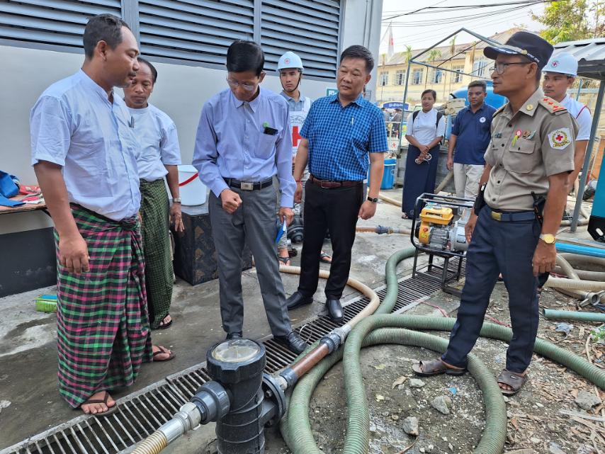 သမဝါယမနှင့် ကျေးလက်ဖွံ့ဖြိုးရေးဝန်ကြီးဌာန၊ ဒုတိယဝန်ကြီး ဦးမြင့်စိုးသည် ပြည်နယ် လူမှုရေးဝန်ကြီး ဦးအောင်မျိုးနှင့်အတူ ယနေ့နံနက်ပိုင်းတွင် ပြည်နယ်ကြက်ခြေနီရုံးသို့ သွားရောက်ပြီး တွင်းရေကိုစုပ်ယူ၍ ရေသန့်စင်စက်ဖြင့် သန့်စင်ကာ ရပ်ကွက်၊ ကျေးရွာများသို့ သန့်ရှင်းသော သောက်သုံးရေ ဖြန့်ဝေပေးနေမှုအခြေအနေကို အားပေးကြည့်ရှုသည်။ အဆိုပါ ရေသန့်စက်မှ နေ့စဉ် လီတာ ၅၀၀၀၀ (ဂါလန် ၁၁၀၀၀ ခန့်) သန့်စင်ပေးလျက်ရှိပြီး စစ်တွေမြို့ပေါ် ရပ်ကွက်များအပြင် ကျေးရွာများမှလည်း လာရောက်သယ်ယူ အသုံးပြုနေကြောင်း သိရသည်။