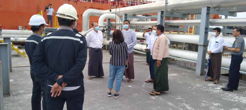 ယင်းနောက် သန်လျင်သီလဝါဆိပ်ကမ်းသို့ရောက်ရှိပြီး မြန်မာနိုင်ငံစက်သုံးဆီ တင်သွင်းရောင်းချဖြန့်ဖြူးရေးအသင်းမှ တာဝန်ရှိသူများက စက်သုံးဆီသင်္ဘောများ ဝင်ရောက်ရန် စီမံထားရှိမှု၊ ယခုအပတ်ရုံးပိတ်ရက်ရှည်အတွင်း စက်သုံးဆီဆိုင်များ တွင်စက်သုံးဆီများပြတ်လပ်မှုမရှိစေရေး ဆောင်ရွက်ထားရှိသည့် အစီအမံများကို သက်ဆိုင်ရာတာဝန်ရှိသူများက ရှင်းလင်းတင်ပြခဲ့မှုများအပေါ် လိုအပ်သည်များ ပေါင်းစပ် ညှိနှိုင်း ဆောင်ရွက်ပေးခဲ့ပြီး Regency၊ Elite စက်သုံးဆီ တံတားများ၌ ဆိုက်ကပ်ထားသော ရေယာဉ်များမှ ဆီချနေမှုများကို လိုက်လံကြည့်ရှု့စစ်ဆေးခဲ့ကြောင်း သိရသည်။