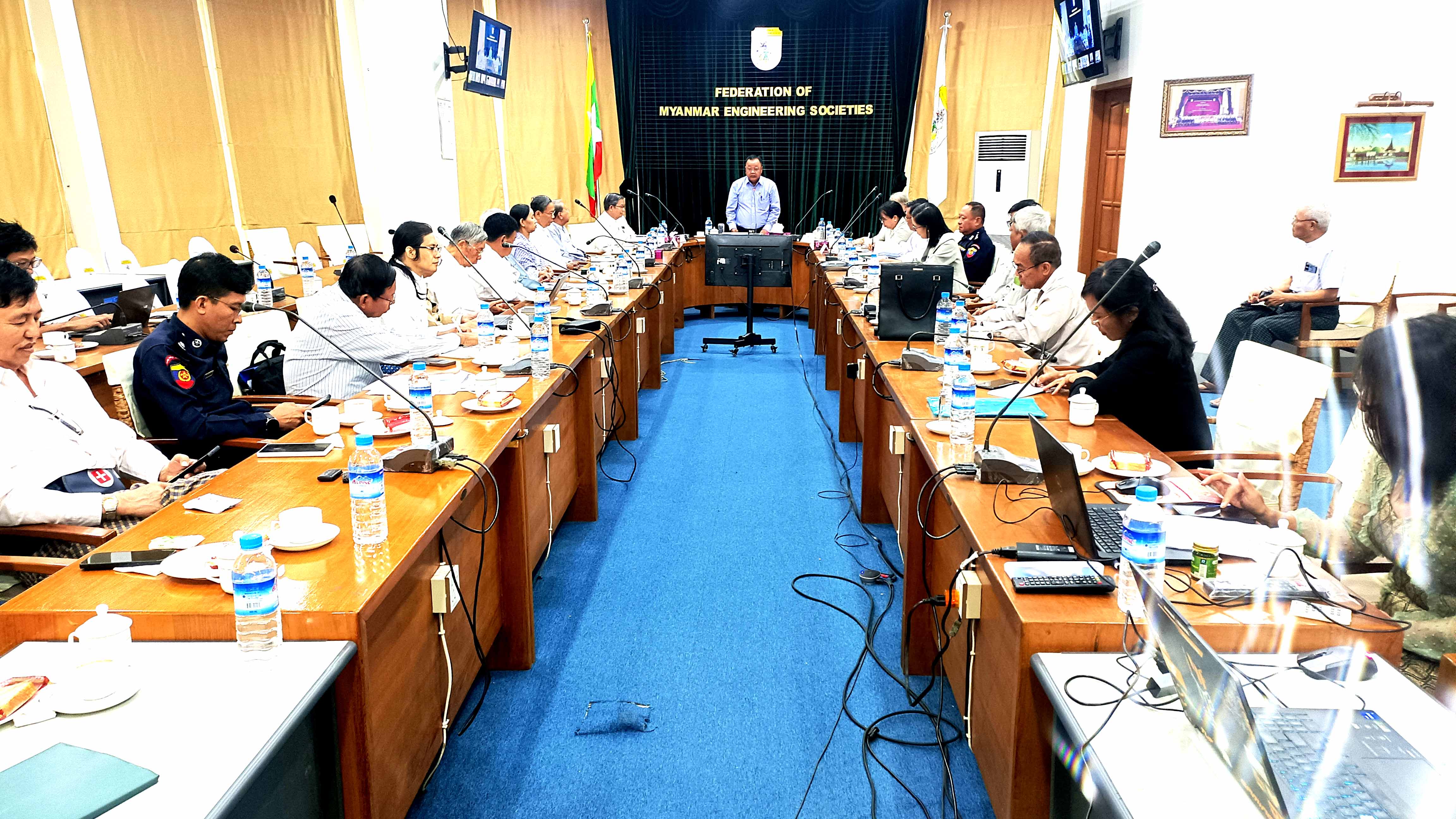 မြန်မာနိုင်ငံအဆောက်အဦဆိုင်ရာ စံချိန်စံညွှန်း လမ်းညွှန်ချက်များ (Myanmar National Building Code – 2025) အကောင်အထည်ဖော်ရေး လုပ်ငန်းကော်မတီအစည်းအဝေး (၁/၂၀၂၅) ကို ယနေ့ နံနက်ပိုင်းတွင် ရန်ကုန်တိုင်းဒေသကြီး၊ လှိုင်မြို့နယ်ရှိ မြန်မာနိုင်ငံအင်ဂျင်နီယာအသင်းချုပ်ရုံး အစည်းအဝေး ခန်းမ၌ ကျင်းပသည်။