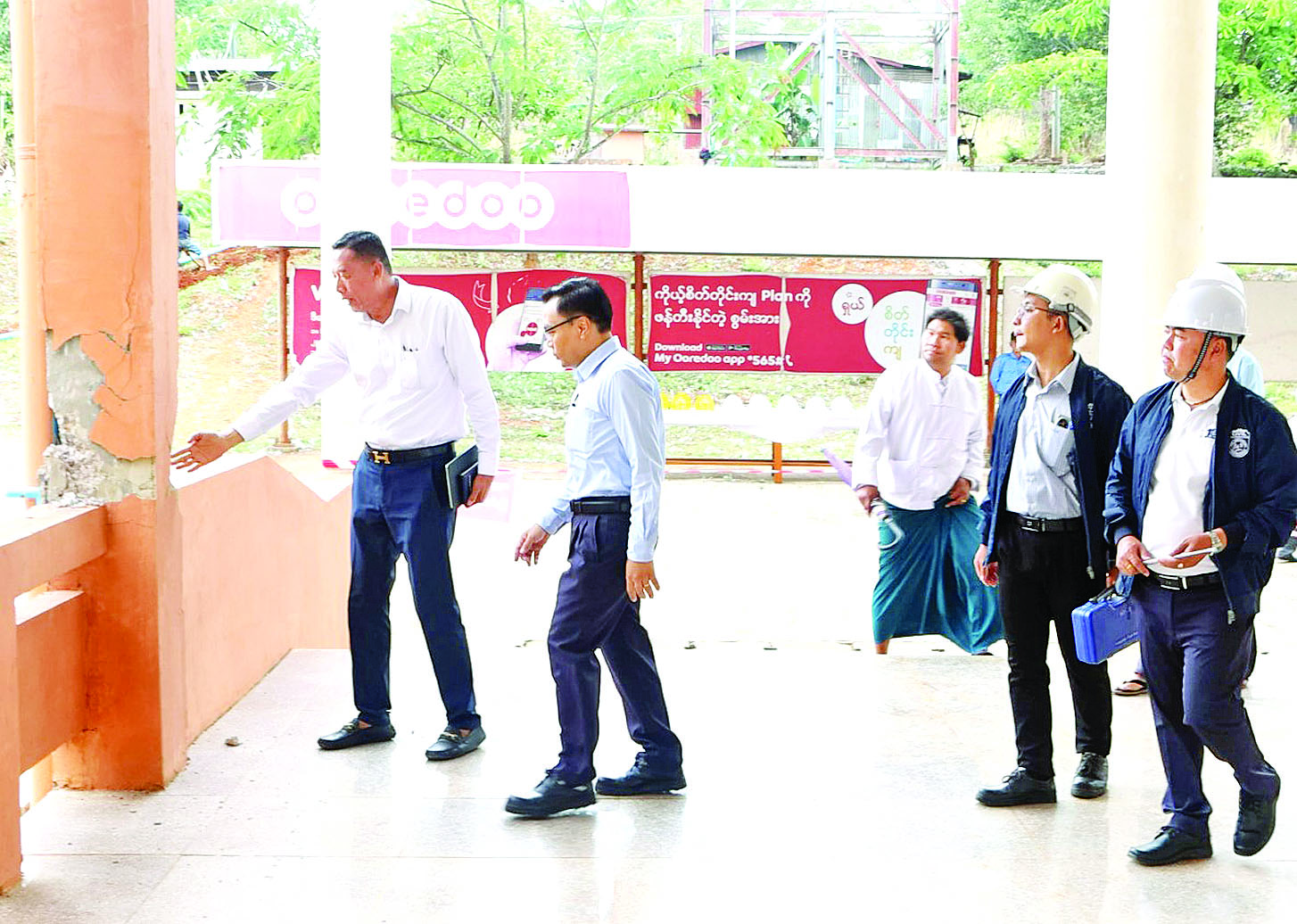 ယင်းနောက် ဒုတိယဝန်ကြီးနှင့်အဖွဲ့သည် ပင်မသုံးထပ် စာသင်ဆောင်ရှိလော်ဘီ၌ ကွန်ကရစ်တိုင်များ၊ Bean လိုင်း များနှင့် လှေကားခွင်တွင် Structure နှင့် Strength ထိခိုက် ပျက်စီးမှုအခြေအနေများ၊ မြေညီ ထပ်၊ ပထမထပ်နှင့် ဒုတိယ ထပ်တို့တွင် ကွန်ကရစ်တိုင်များ၊ Bean လိုင်းများ၊ နံရံများ၊ မျက်နှာကြက်များ၊ လှေကားခွင်များ၊ Joint အဆက် ကော်လံတိုင်များတွင် ထိခိုက်ပျက်စီးမှု အခြေအနေများကို လှည့်လည်ကြည့်ရှုစစ်ဆေးကြသည်။