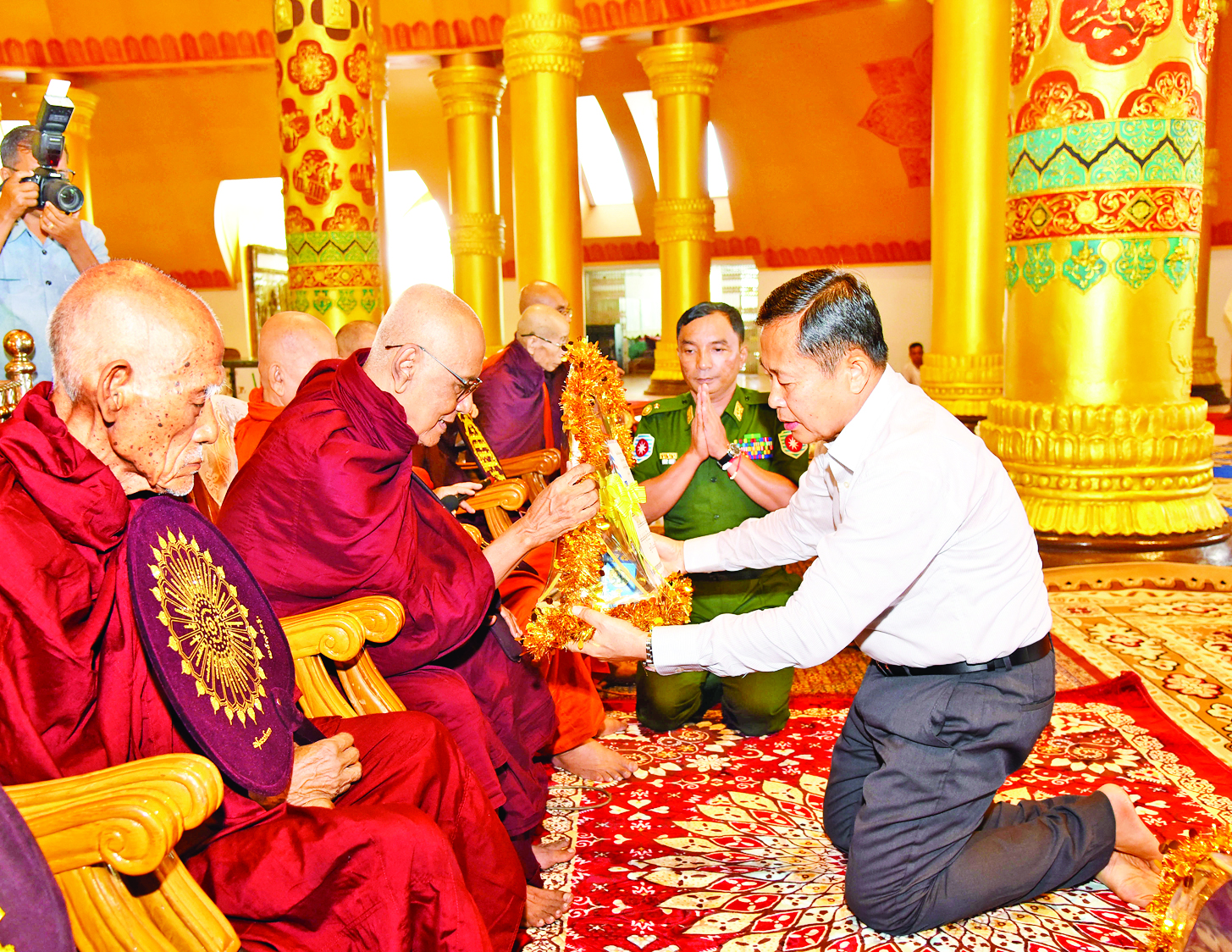 ထို့နောက် သာသနာရေးနှင့် ယဉ်ကျေးမှုဝန်ကြီးဌာန ဒုတိယဝန်ကြီး ဒေါ်နုမြဇံက ရခိုင်ပြည်နယ် အတွင်း မိုခါမုန်တိုင်း တိုက်ခတ်မှုကြောင့် ပျက်စီးသွားသော ဘုန်းတော်ကြီးကျောင်းများနှင့် ဘုန်းတော်ကြီးသင် ပညာရေးကျောင်းများအတွက် အလှူတော် ငွေကျပ်သိန်း ၁၀၆၀ ကို ပေးအပ် လှူဒါန်းရာ ရခိုင်ပြည်နယ်ဝန်ကြီးချုပ် ဦးထိန်လင်းက လက်ခံရယူ သည်။
