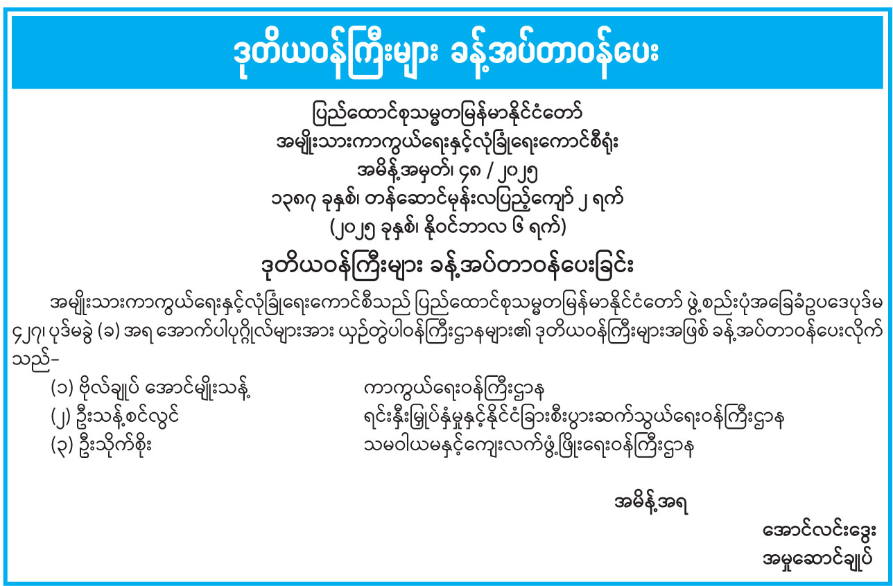 ဒုတိယဝန်ကြီးများ ခန့်အပ်တာဝန်ပေး