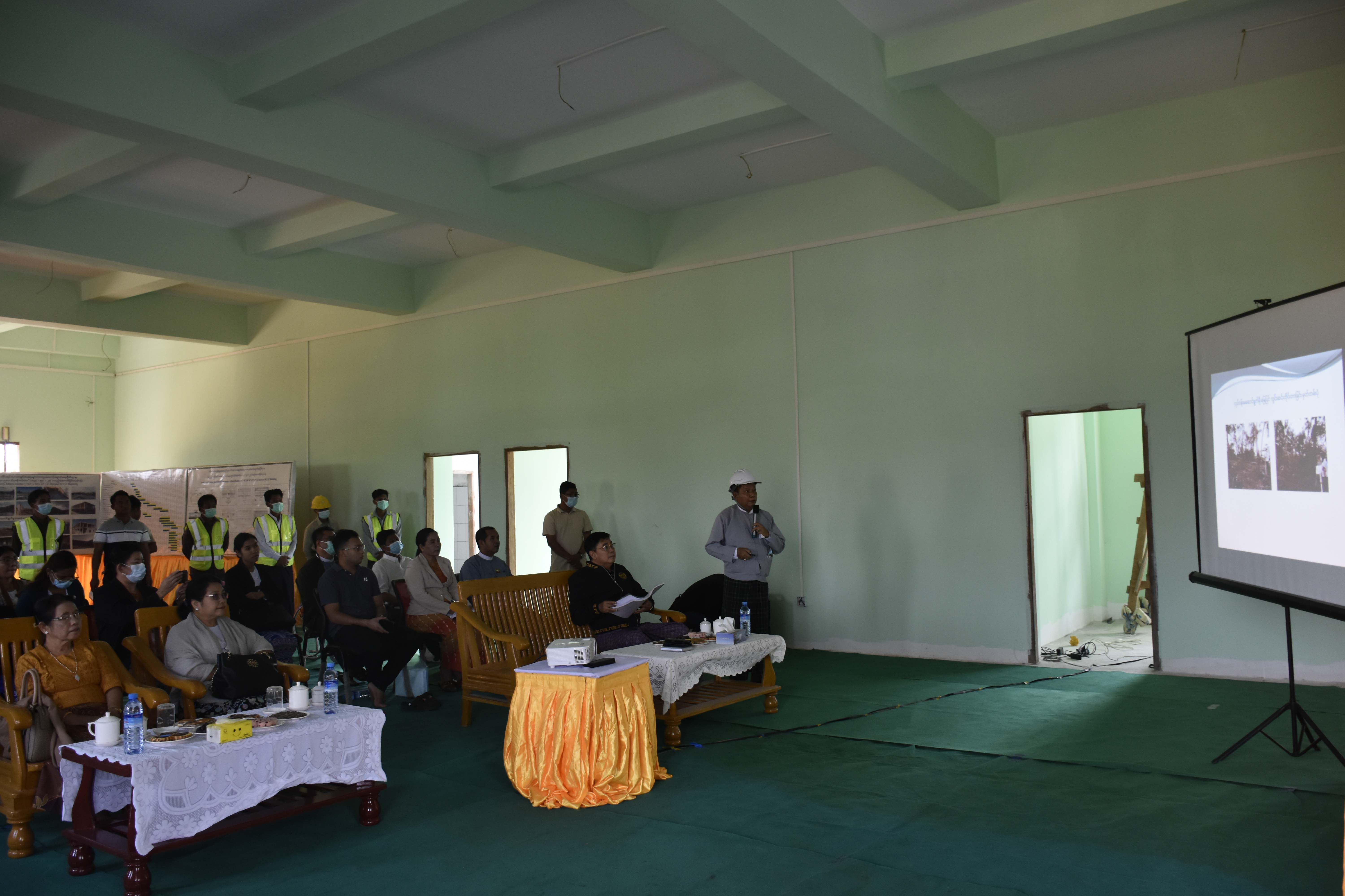 ဦးစွာ မြေညီထပ်ရှင်းလင်းဆောင်တွင် အဆောက်အဦကို တာဝန်ယူတည်ဆောက်နေသည့် မိုးယံဝင့်ချီကုမ္ပဏီလီမိတက်မှ တာဝန်ရှိသူတစ်ဦးက လုပ်ငန်းဆောင်ရွက် ပြီးစီးမှုကို ရှင်းလင်းတင်ပြသည်။