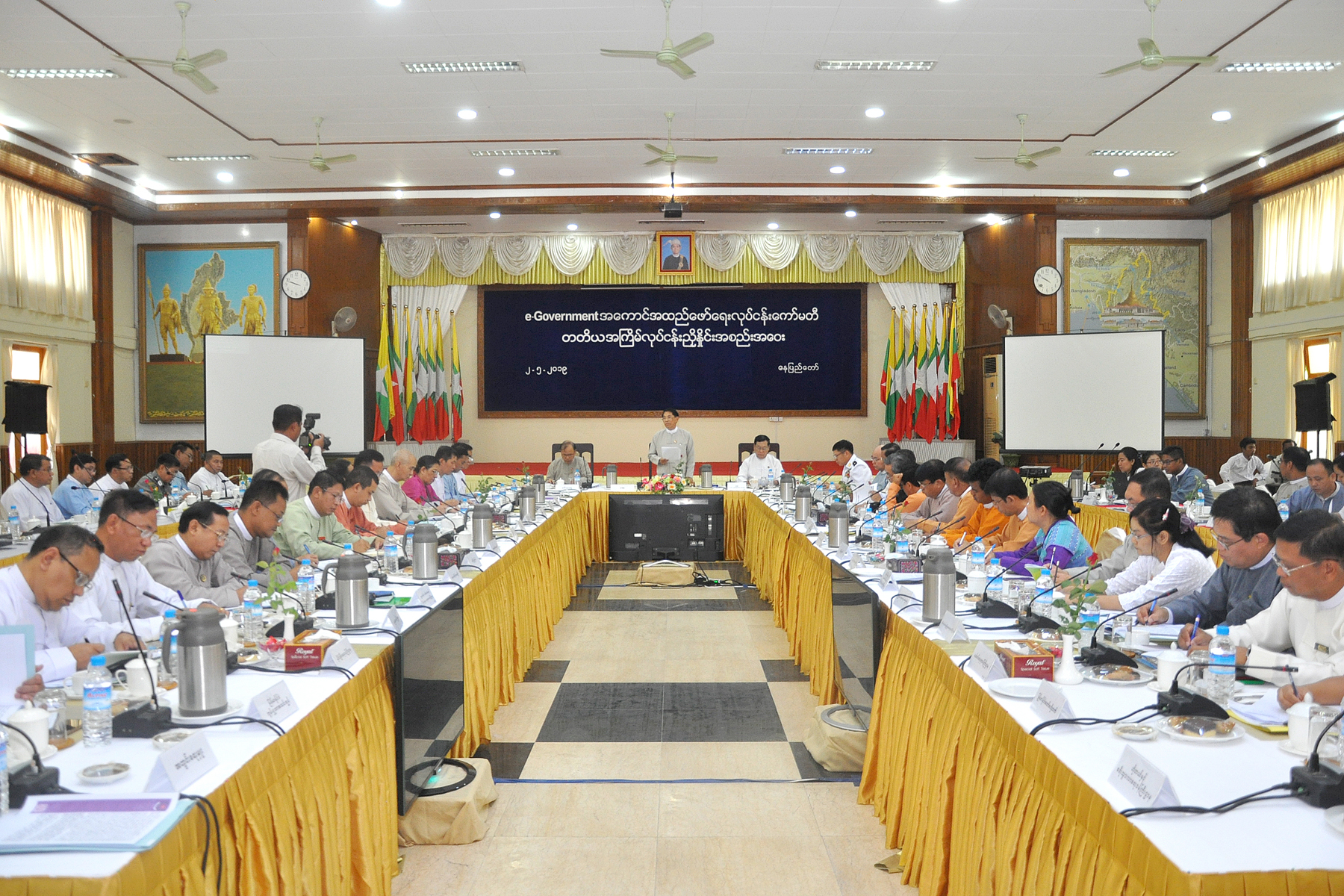 e-Government အကောင်အထည်ဖော်ရေး လုပ်ငန်းကော်မတီ တတိယအကြိမ် လုပ်ငန်းညှိနှိုင်းအစည်းအဝေးကို ယနေ့နံနက်ပိုင်းတွင် နေပြည်တော်ရှိ ပို့ဆောင်ရေးနှင့် ဆက်သွယ်ရေးဝန်ကြီးဌာန ရုံးအမှတ် (၂)တွင် ပြုလုပ်ရာ e-Government အကောင်အထည်ဖော်ရေး လုပ်ငန်းကော်မတီ ဥက္ကဋ္ဌ ပြည်ထောင်စုအစိုးရအဖွဲ့ရုံး ဝန်ကြီးဌာန ပြည်ထောင်စုဝန်ကြီး ဦးမင်းသူနှင့် ကော်မတီဒုတိယဥက္ကဋ္ဌ ပို့ဆောင်ရေးနှင့် ဆက်သွယ်ရေးဝန်ကြီးဌာန ပြည်ထောင်စုဝန်ကြီး ဦးသန့်စင်မောင်တို့ တက်ရောက်အမှာစကား ပြောကြားသည်။