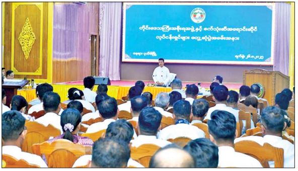 ဧရာဝတီတိုင်းဒေသကြီး အစိုးရအဖွဲ့နှင့် စက်သုံးဆီအရောင်းဆိုင် လုပ်ငန်းရှင်များ တွေ့ဆုံပွဲကို ယနေ့နံနက်ပိုင်းက ပုသိမ်မြို့ ဧရာရွှေဝါခန်းမ၌ ကျင်းပရာ ဧရာဝတီတိုင်းဒေသကြီးဝန်ကြီးချုပ် ဦးတင်မောင်ဝင်းက အမှာစကားပြောကြားသည်။