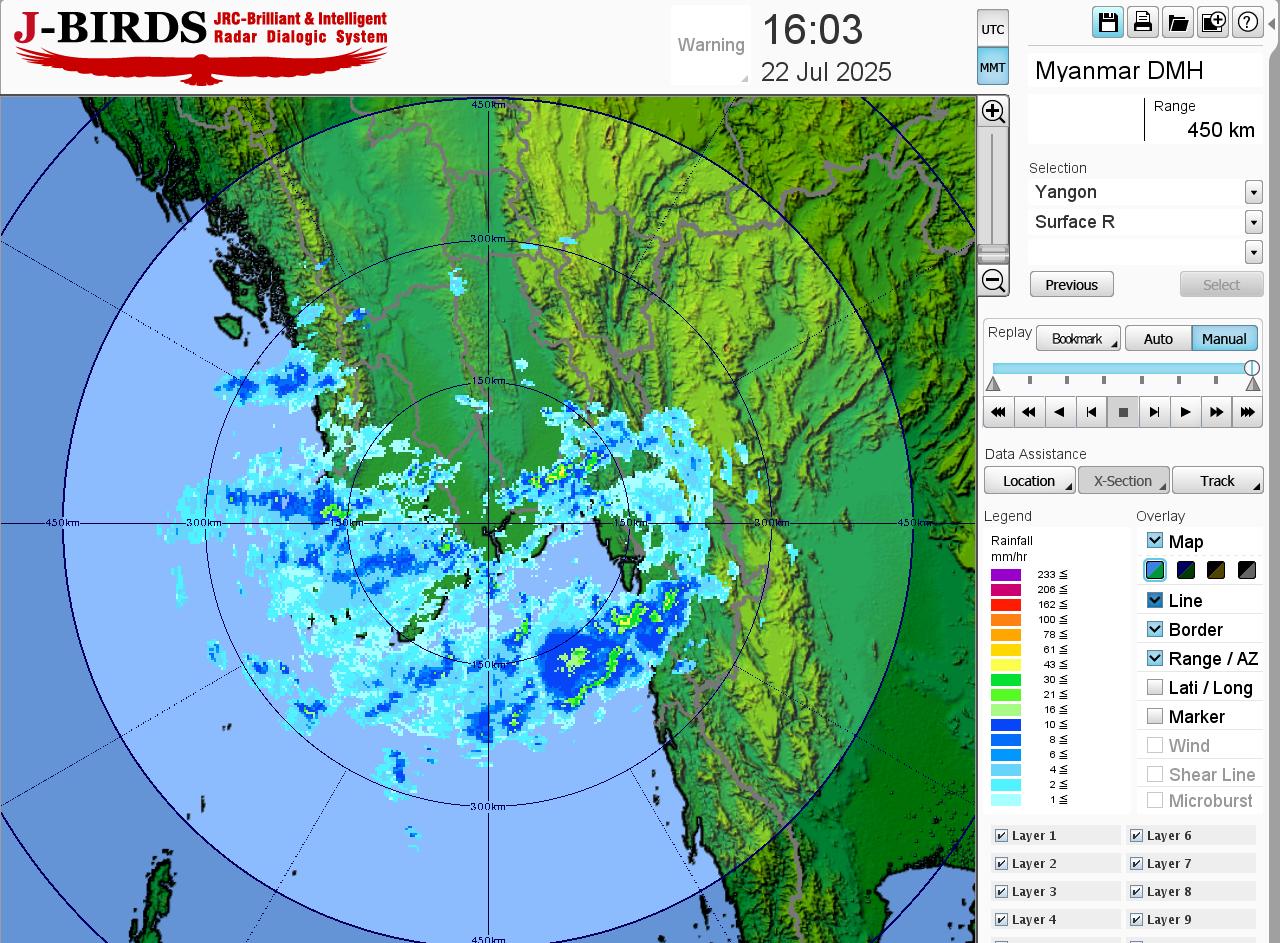 ထူးခြားသည့်အခြေအနေ။ ယနေ့မြန်မာစံတော်ချိန် ၁၅:၃၀ နာရီအချိန် တိုင်းထွာချက်များအရ ဗီယက်နမ်နိုင်ငံကုန်းတွင်းပိုင်းဒေသများကို ဖြတ်ကျော်လျက်ရှိသော အပူပိုင်းမုန်တိုင်း “ဝီဖာ” (WIPHA) သည် အနောက်-အနောက်မြောက်ဘက်သို့ ရွေ့လျားနိုင်ပြီး၊ ဗီယက်နမ်နိုင်ငံ ကုန်းတွင်းပိုင်းဒေသများကို ဆက်လက်ဖြတ်ကျော်ကာ၊ နောက် ၁၈ နာရီအတွင်း လာအိုနိုင်ငံပေါ်တွင် ကုန်းတွင်းမုန်တိုင်းငယ်အဖြစ် အားလျော့သွားမည်ဟု ခန့်မှန်းရပါသည်။ အဆိုပါ အပူပိုင်းမုန်တိုင်း “ဝီဖာ” မှ ပြတ်ထွက်လာသော တိမ်တိုက်များနှင့် အကြွင်းအကျန်တိမ်တိုက် များကြောင့် ယနေ့ညနေမှ ၂၅-၇-၂၀၂၅ ရက်နေ့အတွင်း နေပြည်တော်၊ ရန်ကုန်တိုင်းဒေသကြီး၊ မန္တလေးတိုင်းဒေသကြီး၊ ပဲခူးတိုင်းဒေသကြီး၊ မကွေးတိုင်းဒေသကြီး၊ စစ်ကိုင်းတိုင်းဒေသကြီးအောက်ပိုင်း၊ ဧရာဝတီတိုင်းဒေသကြီး၊ တနင်္သာရီတိုင်းဒေသကြီး၊ ကယားပြည်နယ်၊ ကရင်ပြည်နယ်၊ ချင်းပြည်နယ်၊ မွန်ပြည်နယ်၊ ရခိုင်ပြည်နယ်နှင့် ရှမ်းပြည်နယ်တို့တွင် မိုးသည်းထန်ခြင်းနှင့်အတူ လေပြင်းတိုက်ခတ်ခြင်းများ ဖြစ်ပေါ်နိုင်သည်ဟု ခန့်မှန်းရပါသည်။