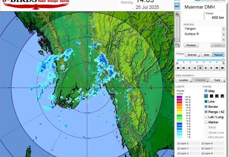 မိုးတိမ်တောင်ဖြစ်ပေါ်မှုအခြေအနေ။ ရန်ကုန်တိုင်းဒေသကြီး၊ ပဲခူးတိုင်းဒေသကြီး၊ ဧရာဝတီတိုင်းဒေသကြီးနှင့် ရခိုင်ပြည်နယ်တို့တွင် မိုးတိမ်တောင်များ ဖြစ်ထွန်းလျက် ရှိပြီး၊ အဆိုပါ မိုးတိမ်တောင်များရွေ့လျားရာ နေရာတစ်လျှောက်တွင် မိုးရွာသွန်းခြင်းနှင့်အတူ လေပြင်းတိုက်ခတ်ခြင်း၊ မိုးထစ်ချုန်းခြင်း၊ မိုးကြိုးပစ်ခြင်း၊ လျှပ်စီးလက်ခြင်းနှင့် မိုးသီးကြွေခြင်းစသည့် မိုးလေဝသဖြစ်စဉ်များ ဖြစ်ပေါ်နိုင်ပါသဖြင့် ကြိုတင်သတိပြုနိုင်ပါရန် အကြံပြုအပ်ပါသည်။