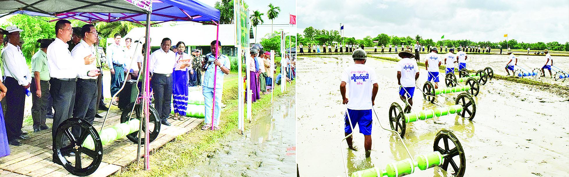 ဦးစွာ ဧရာဝတီတိုင်းဒေသကြီး ညောင်တုန်းမြို့နယ် ဆားမလောက်ကျေးရွာရှိ နည်းပညာ ပြန့်ပွားရေး စင်တာ (Knowledge Center) သို့ ရောက်ရှိပြီး တောင်သူများ မျိုးစေ့ချကိရိယာ (Drum Seeder)ဖြင့် မျိုးစေ့ချ သရုပ်ပြပွဲကို ကြည့်ရှုအားပေးကာ ပြည်ထောင်စုဝန်ကြီးနှင့် တိုင်းဒေသကြီး ဝန်ကြီးချုပ်တို့က ဆားမလောက်ရွာ၊ သက်ရင်းကျောင်းရွာ၊ ဇီးဖြူကျွန်းရွာ၊ ဝါးတောရွာ၊ ထူးချောင်းရွာတို့မှ တောင်သူများအား မျိုးစေ့ချကိရိယာ နှင့် MRTV DTH စလောင်းများကို ပေးအပ်ကြသည်။