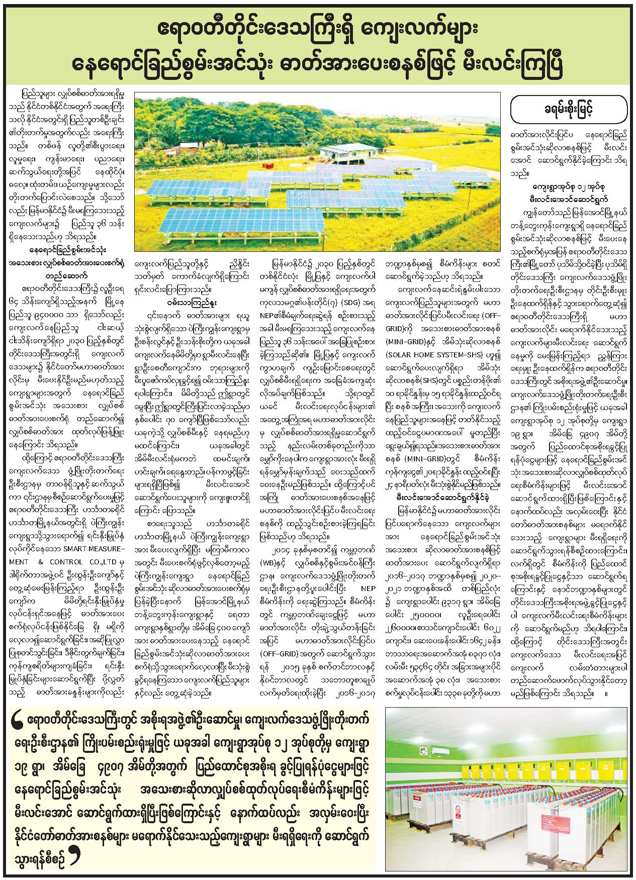 ဧရာဝတီတိုင်းဒေသကြီးရှိ ကျေးလက်များ နေရောင်ခြည်စွမ်းအင်သုံး ဓာတ်အားပေးစနစ်ဖြင့် မီးလင်းကြပြီ