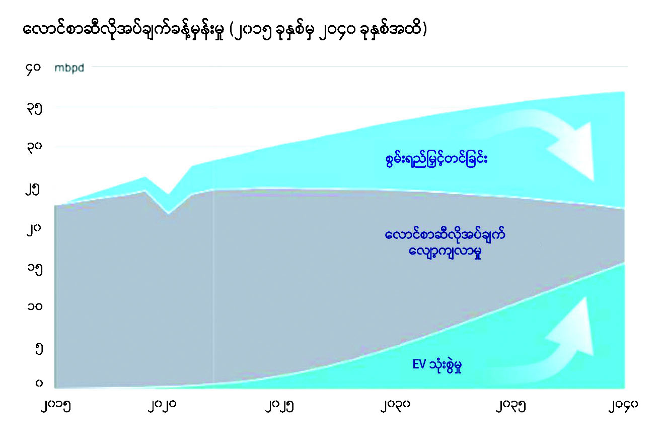 EV ကြီးထွားလာမှုက လောင်စာဆီသုံးကားရောင်းအားအမြင့်ဆုံးဖြစ်ခဲ့သည့် ၂၀၁၇ ခုနှစ်နှင့် လောင်စာဆီလိုအပ်ချက်အမြင့်ဆုံးဖြစ်ခဲ့သည့် ၂၀၁၉ ခုနှစ်များအပြီး ယခုဆယ်စုနှစ်၏ အလယ်ပိုင်းတွင် လောင်စာဆီသုံးကားဈေးကွက်သည် အမြင့်ဆုံးသို့ ရောက်ရှိမည်ဟု ဆိုနိုင်သည်။ ပုံ-၃ တွင် တွေ့မြင်ရသည့်အတိုင်း လောင်စာဆီသုံးကားများအတွက် ရေနံလိုအပ်ချက်သည် ဆက်တိုက်တိုးတက်နေသော စွမ်းအင်စွမ်းရည်မြှင့်တင်စနစ်များနှင့် EV များ၏ ထွန်းကားလာမှုကြားတွင် ညှစ်ချုပ်ခံရမည်ဖြစ်သည်။ EV များသည် ကားရောင်းအားတစ်ခုလုံး၏ အများစုဖြစ်လာနိုင်ပြီး နောင်လာမည့် ၁၅ နှစ်အတွင်း လောင်စာဆီလိုအပ်ချက်၏ လေးပုံတစ်ပုံသည် သုညသို့ ကျဆင်းသွားမည်ဖြစ်သည်။ ကမ္ဘာ့တောင်ပိုင်း ဒေသများရှိ ဖွံ့ဖြိုးပြီးယာဉ်ဈေးကွက်များဖြစ်သည့် ဆိုင်ကယ်၊ သုံးဘီးယာဉ်များနှင့် လုပ်ငန်းသုံးယာဉ်များကလည်း EV လမ်းကြောင်းကို လျှောက်လှမ်းနေကြပြီဖြစ်ရာ ကုန်းကြောင်းပို့ဆောင် ရေးကဏ္ဍမှ ကမ္ဘာ့ရေနံဝယ်လိုအား၏တစ်ဝက်မှာ မကြာမီကျဆင်းသွားမည်ဟု သုံးသပ်နိုင်ပါသည်။