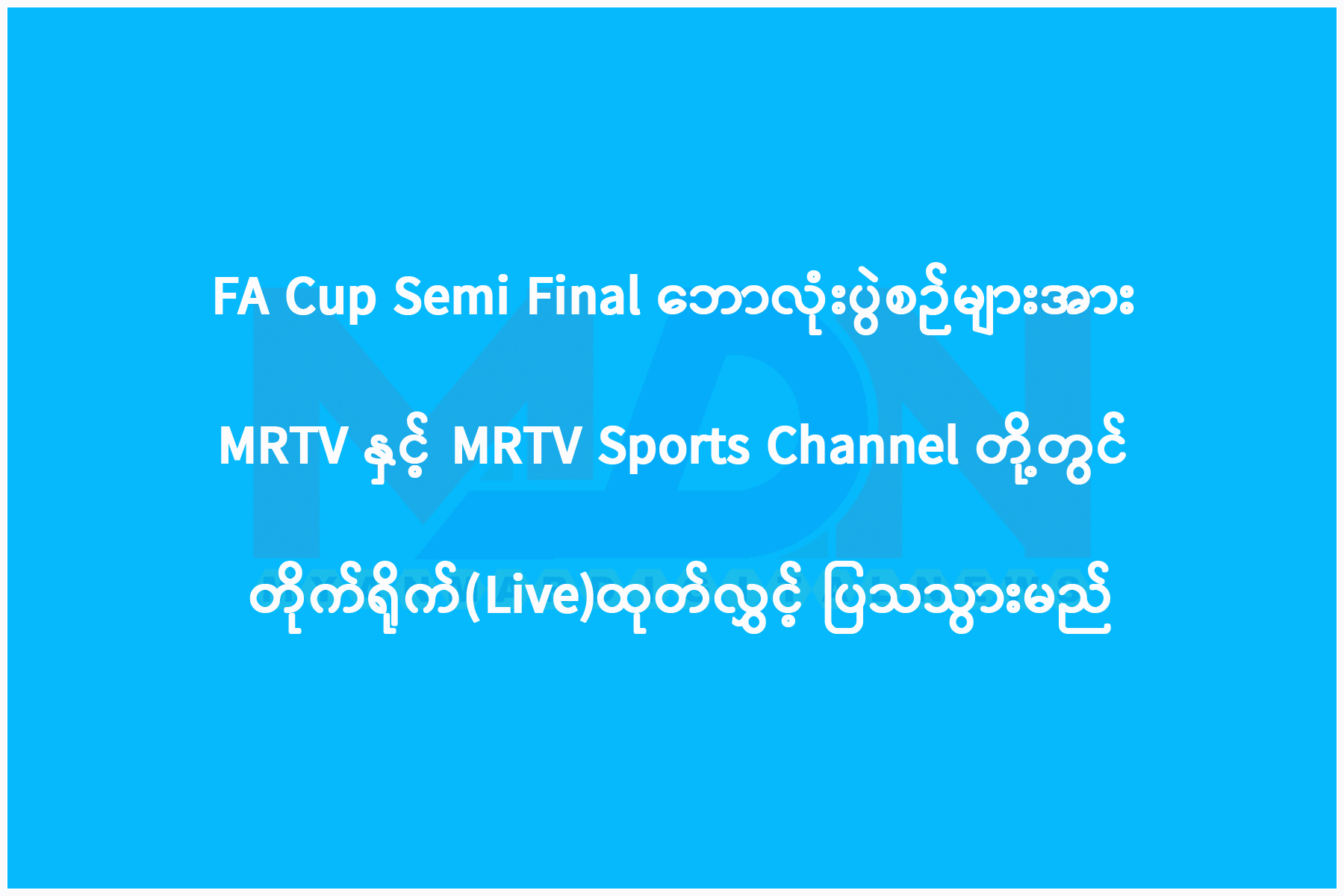 အင်္ဂလန် FA Cup Semi Final ပွဲစဉ်များအဖြစ် Arsenal အသင်းနှင့် Manchester City အသင်းတို့ရဲ့ ပွဲစဉ်ကို ဇူလိုင် ၁၉ ရက်၊ တနင်္ဂနွေနေ့ နံနက် ၁ နာရီ ၁၅ မိနစ် အချိန်တွင်လည်းကောင်း ၊ Manchester United အသင်းနှင့် Chelsea အသင်းတို့ရဲ့ ပွဲစဉ်များကို ဇူလိုင် ၁၉ ရက်နေ့ ည ၁၁ နာရီ မိနစ် ၃၀ အချိန်တွင် လည်းကောင်း MRTV နှင့် MRTV Sports Channel တို့တွင် တိုက်ရိုက် Live ထုတ်လွှင့်ပြသသွားမည် ဖြစ်ပါကြောင်း ကြိုတင်အစီရင်ခံ တင်ပြအပ်ပါသည်။