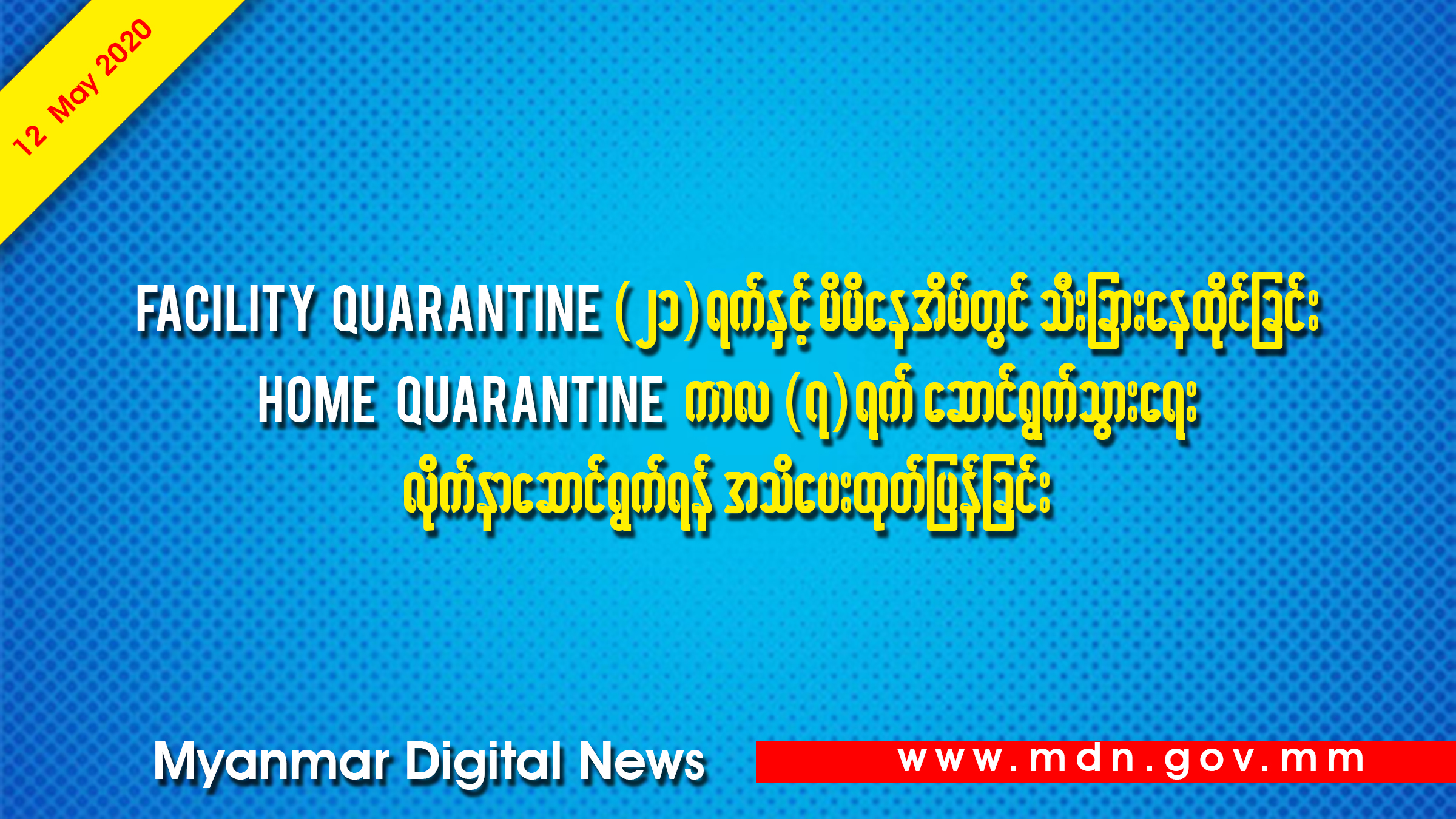 ၁။ ကျန်းမာရေးနှင့် အားကစားဝန်ကြီးဌာ‌နအနေဖြင့် နိုင်ငံတကာမှလာရောက်သည့်ခရီးသည် များနှင့် COVID-19 ဓာတ်ခွဲအတည်ပြုလူနာများနှင့် အနီးကပ် ထိတွေ့သူများထံမှ အခြားသူများသို့ ရောဂါကူးစက်မှု မရှိစေရေးအတွက် လက်ရှိတွင် Facility Quarantine (၁၄)ရက်အား ထားရှိပြီးပါ ကမိမိနေအိမ်သို့ ပြန်လည် သွားရောက်မည့်သူများအတွက် နောက်ထပ်(၁၄)ရက် နေအိမ်တွင်သီးခြား နေထိုင်ရန် အကြံပြု တိုက်တွန်းချက်များ ထုတ်ပြန်ထားပြီး ဖြစ်ပါသည်။